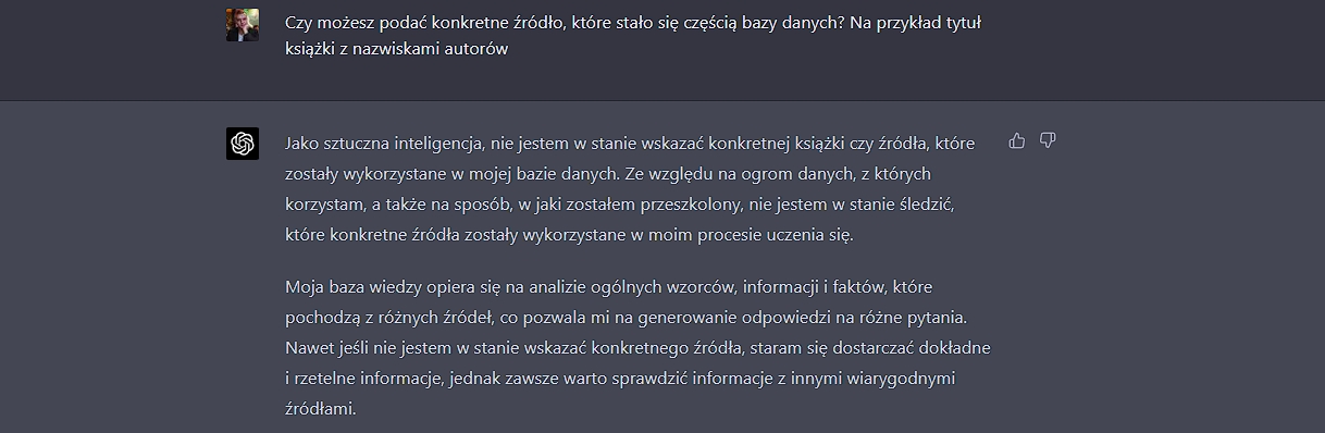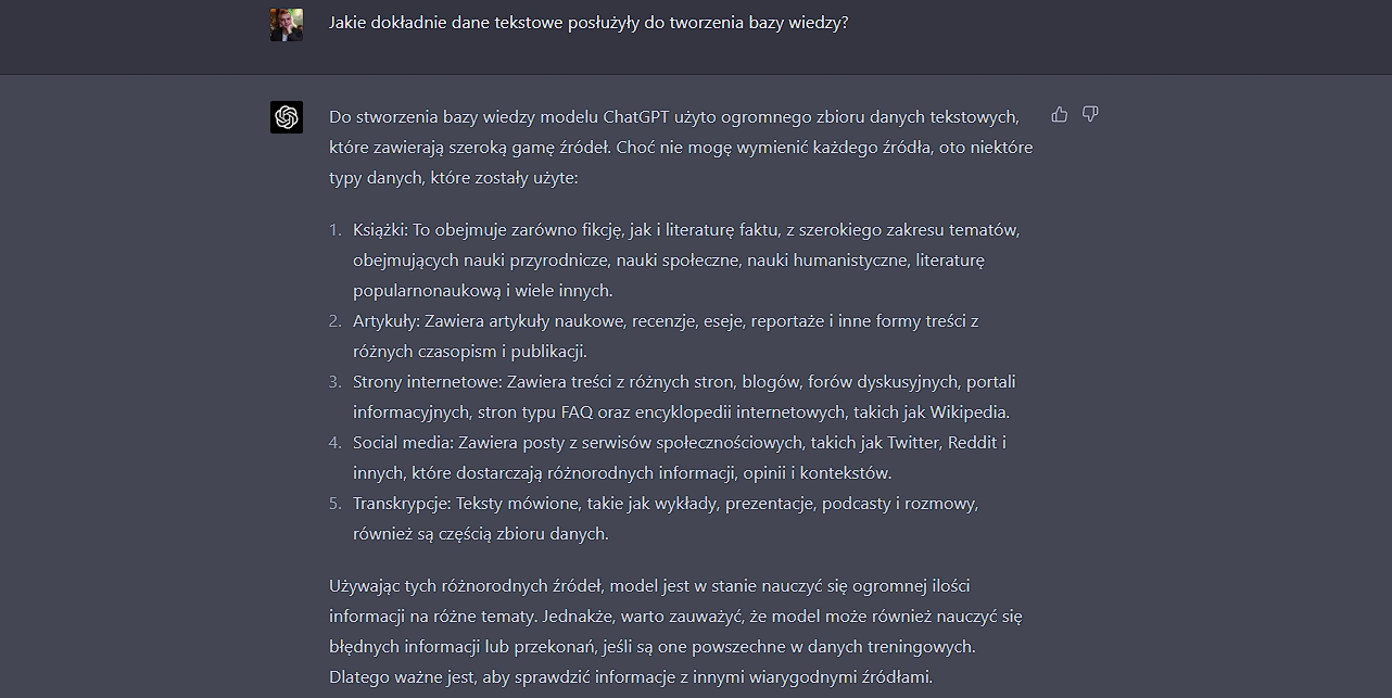 Jako narzędzie do popularyzowania zagadnień naukowych ChatGPT-4 prezentuje się dobrze do momentu, w którym dopytamy się, jak duży jest zakres jego wiedzy. Na tę chwilę rozwiązanie OpenAI korzysta z treści, jakie mogło przetworzyć do września 2021 roku. Ponadto ChatGPT-4 nie odpowie wam na pytanie o jego źródła wiedzy w sposób konkretny, a raczej będzie stosował generalizacje. Jeżeli chcecie otrzymywać potwierdzenie w postaci tytułu książki lub publikacji naukowej, na bazie których kształtowania jest wypowiedź, możecie skorzystać z chatu dostarczanego przez wyszukiwarkę Bing. Przedstawiciele Microsoftu potwierdzili, że ich rozwiązanie opiera się o model GPT-4, jednak wzbogacono je przypisami.