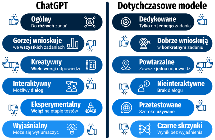 ChatGPT podąża jednak w kierunku ogólnej sztucznej inteligencji (Artificial General Intelligence), która imituje szerokie zdolności poznawcze. Nie skupia się więc na jednej dziedzinie wiedzy, co nieuchronnie prowadzi do szeregu problemów, którym chatbot nie był w stanie stanie stawić czoła w badaniach prowadzonych na Politechnice Wrocławskiej.