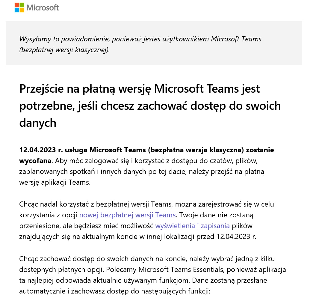 Faktycznie Microsoft Teams Free (classic) odchodzi w dn. 12 kwietnia 2023 roku na zasłużoną emeryturę. Dzieje się tak, ponieważ koncern zamierza dorzucić do płatnej wersji aplikacji (Teams Premium) szereg rozwiązań z zakresu sztucznej inteligencji, którymi podzielił się ostatnio ze światem za sprawą wyszukiwarki Bing. Za sprawą SI Teams Premium będzie w stanie między innymi automatycznie generować notatki z prowadzonych w aplikacji spotkań. Wyobrażam sobie, że tylko ta funkcja może skłonić duże zespoły do zainteresowania się Teamsem Premium, odstawiając konkurencyjne narzędzia, nie posiadające takich możliwości.