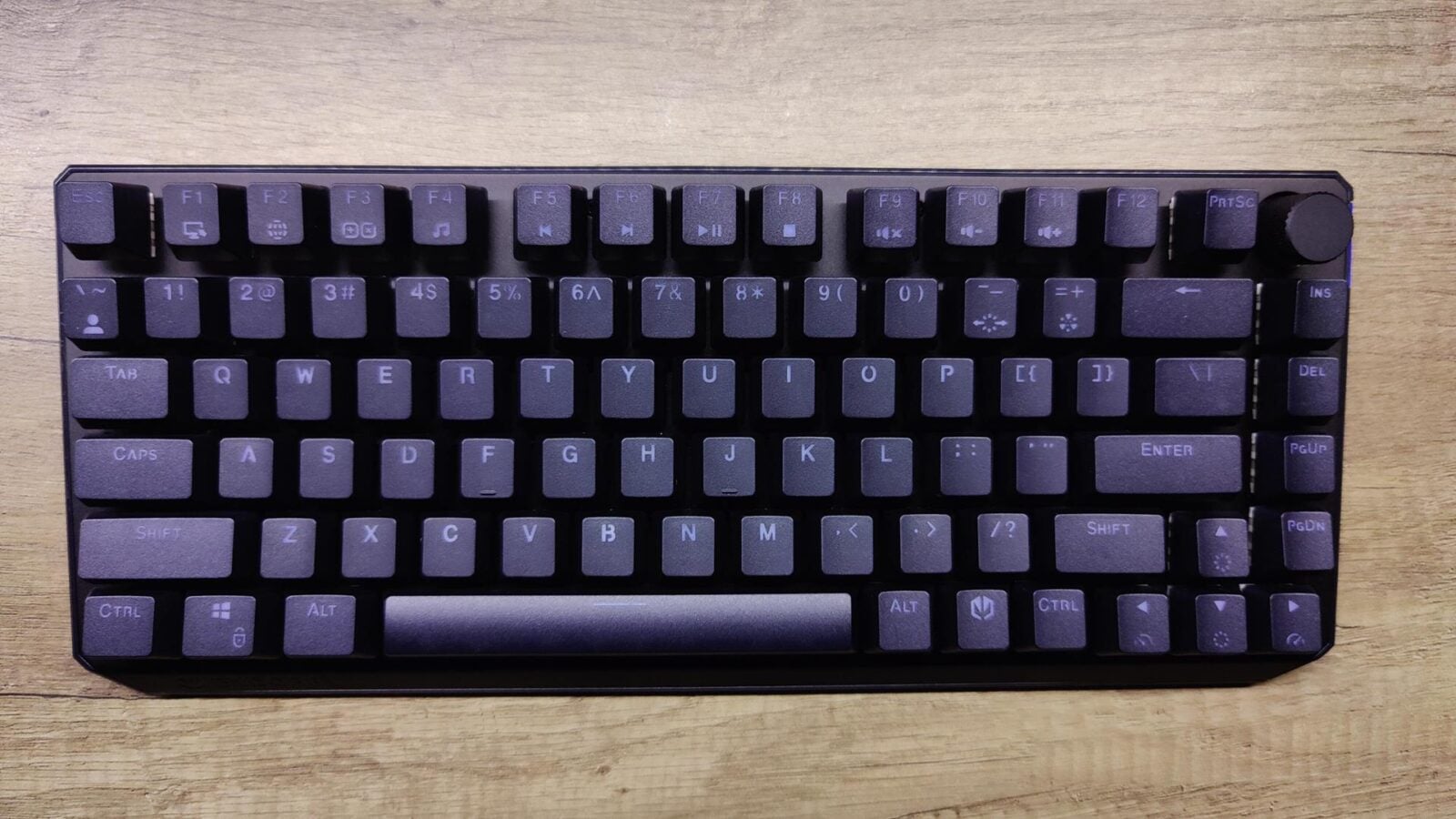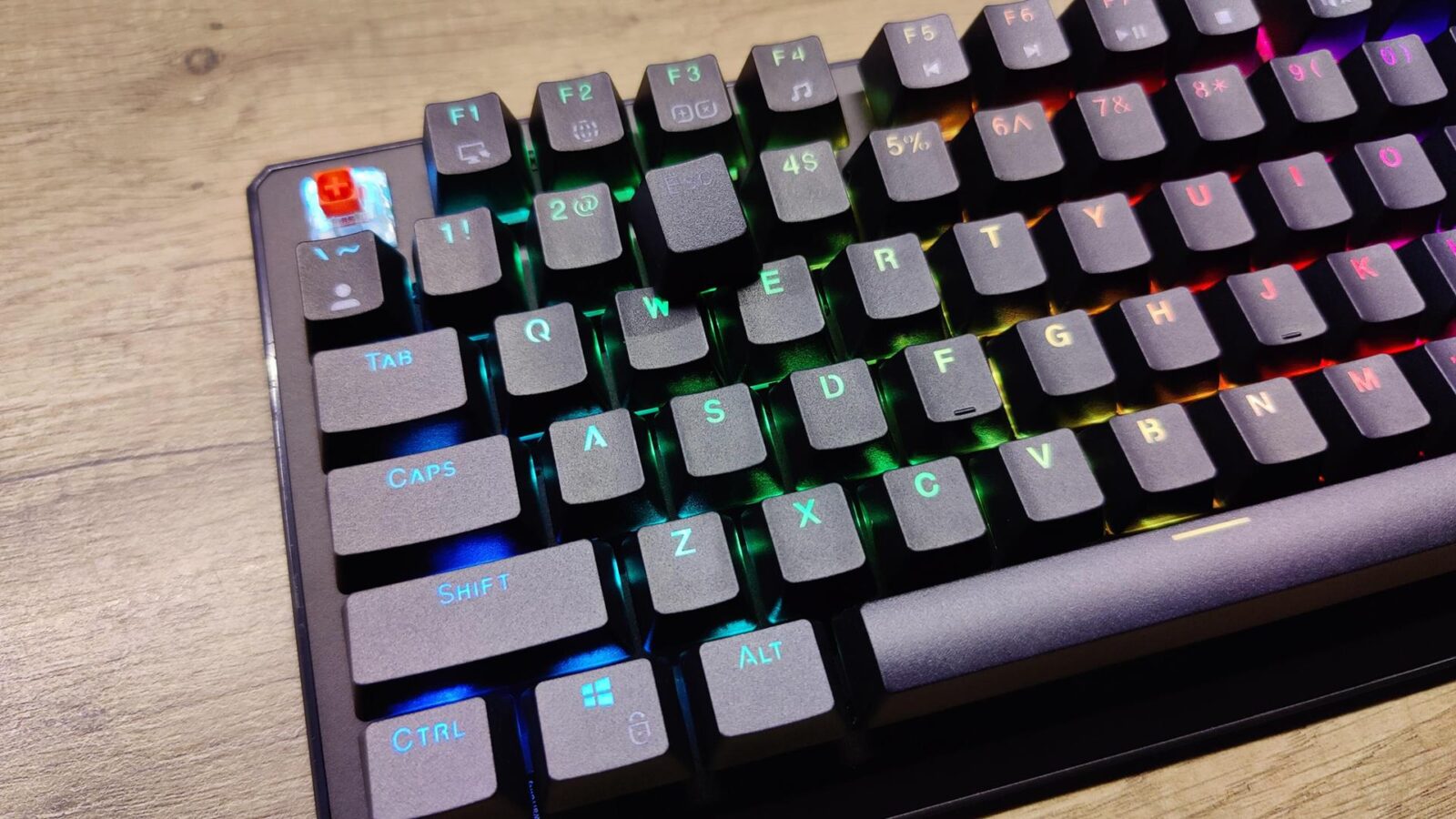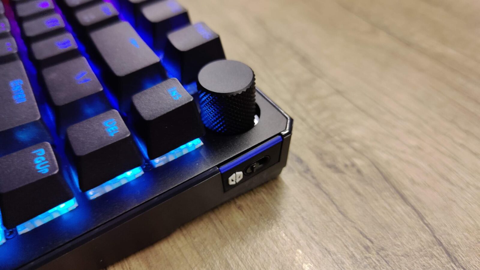 Wracając jeszcze na moment “na górę”, warto wspomnieć o obecności solidnego (aluminiowego) pokrętła dźwięku o ostrych przeskokach z jednego punktu na drugi, którego wciśnięcie całkowicie wycisza dźwięki w systemie oraz jakości samych przycisków. W “keycapowej hierarchii” oceniłbym je na solidne osiem punktów na dziesięć, bo brakuje im podświetlenia funkcji pobocznych oraz wykonania z materiału, który od razu będzie sprawiał wrażenie premium. Ich czcionka jest jednak wyraźna, a technologia wykonania obejmuje wykorzystanie tak zwanej techniki Double Shot, gwarantującej trwałość czcionki.
