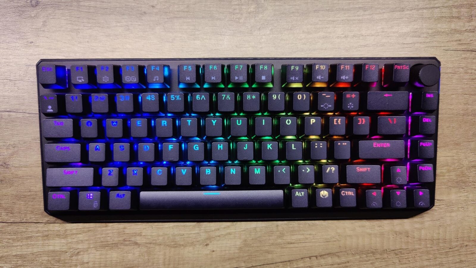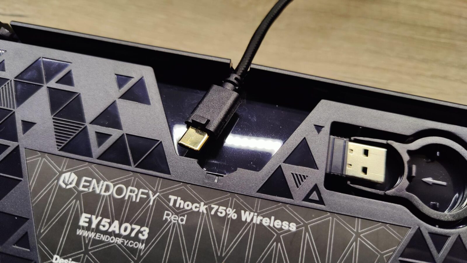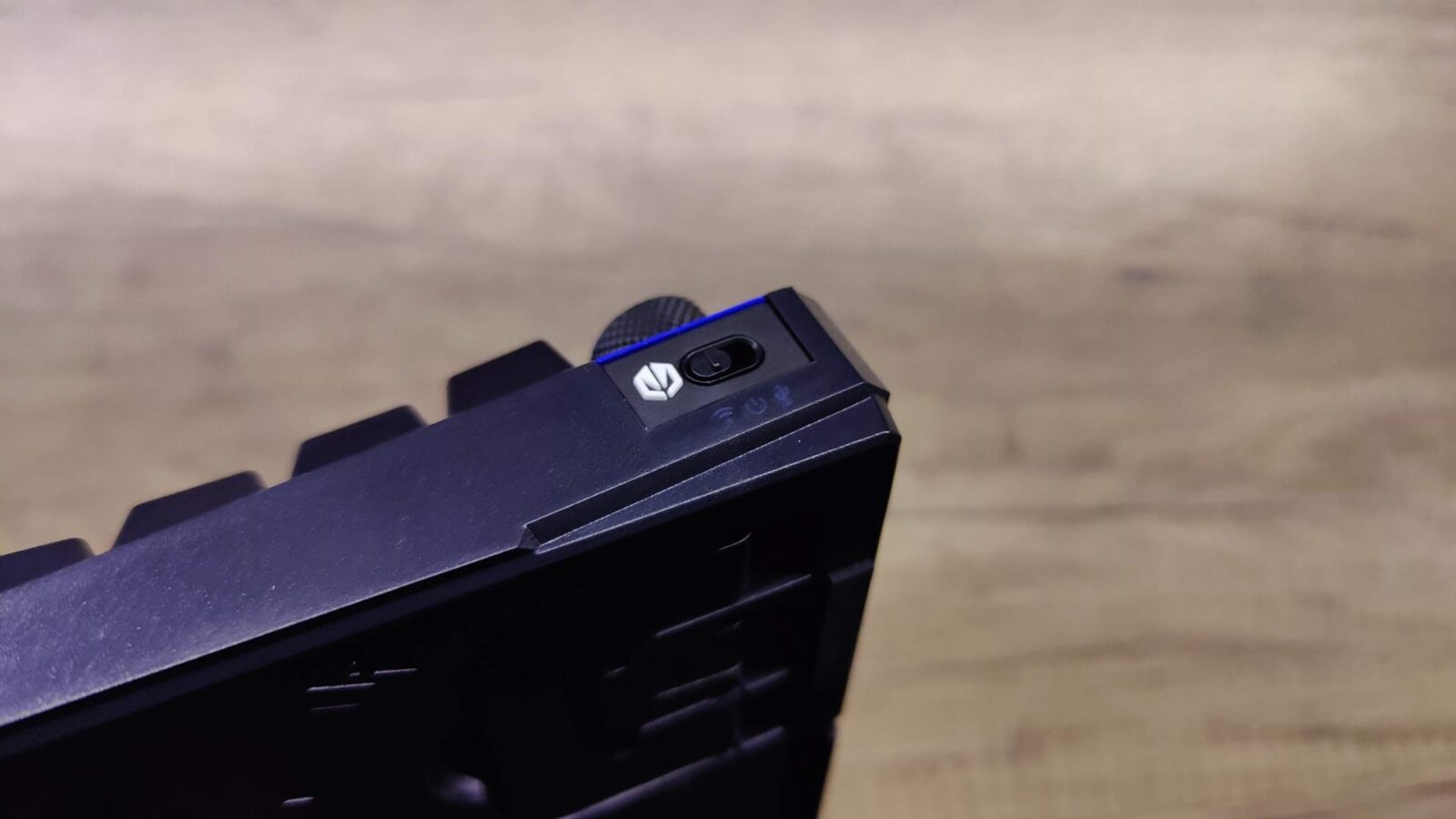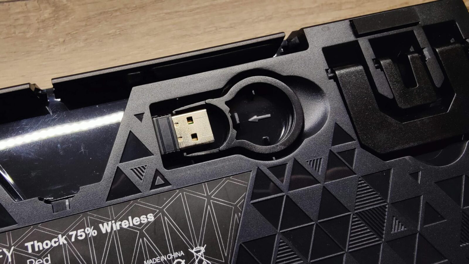 Thock 75% Wireless to jeden z tych modeli, które śmiało możemy nazwać mianem zaawansowanych. Nie tylko przez obecność opisanego wcześniej pokrętła poziomu głośności, ale przede wszystkim przez wsparcie zarówno trybu przewodowego, jak i bezprzewodowego. Zwłaszcza że tyczy się to nie tylko trybu Bluetooth (do 3 jednocześnie połączonych urządzeń), ale też trybu połączenia radiowego za pośrednictwem odbiornik USB-A. W każdej chwili możemy też przesunąć przełącznik trybu pracy na ten przewodowy, podczas którego akumulator jest nieustannie ładowany w tle.
