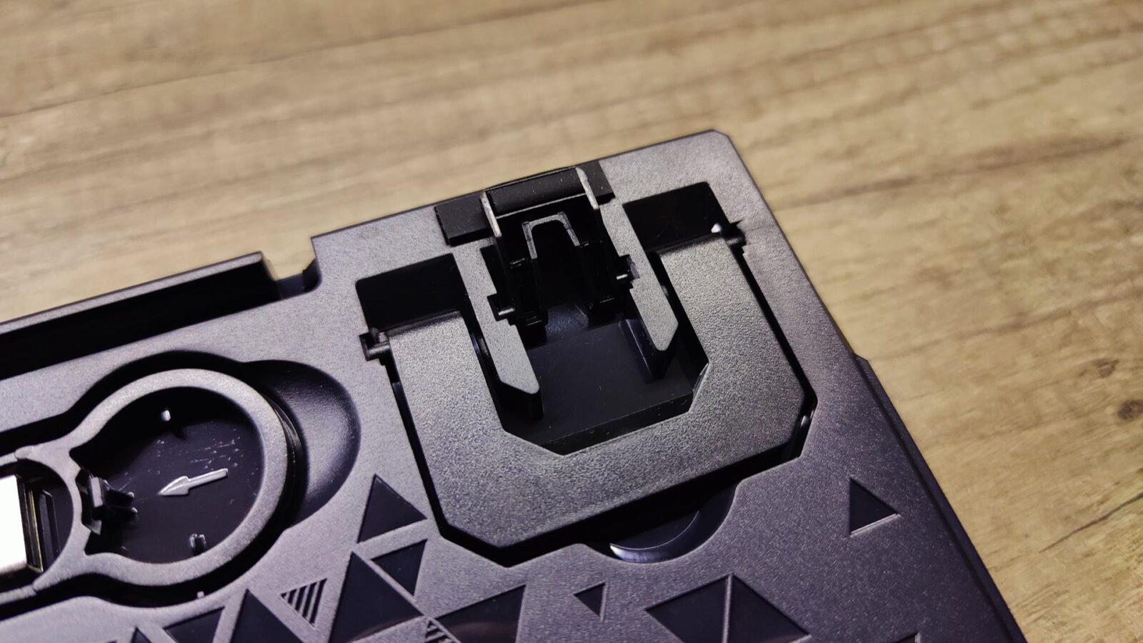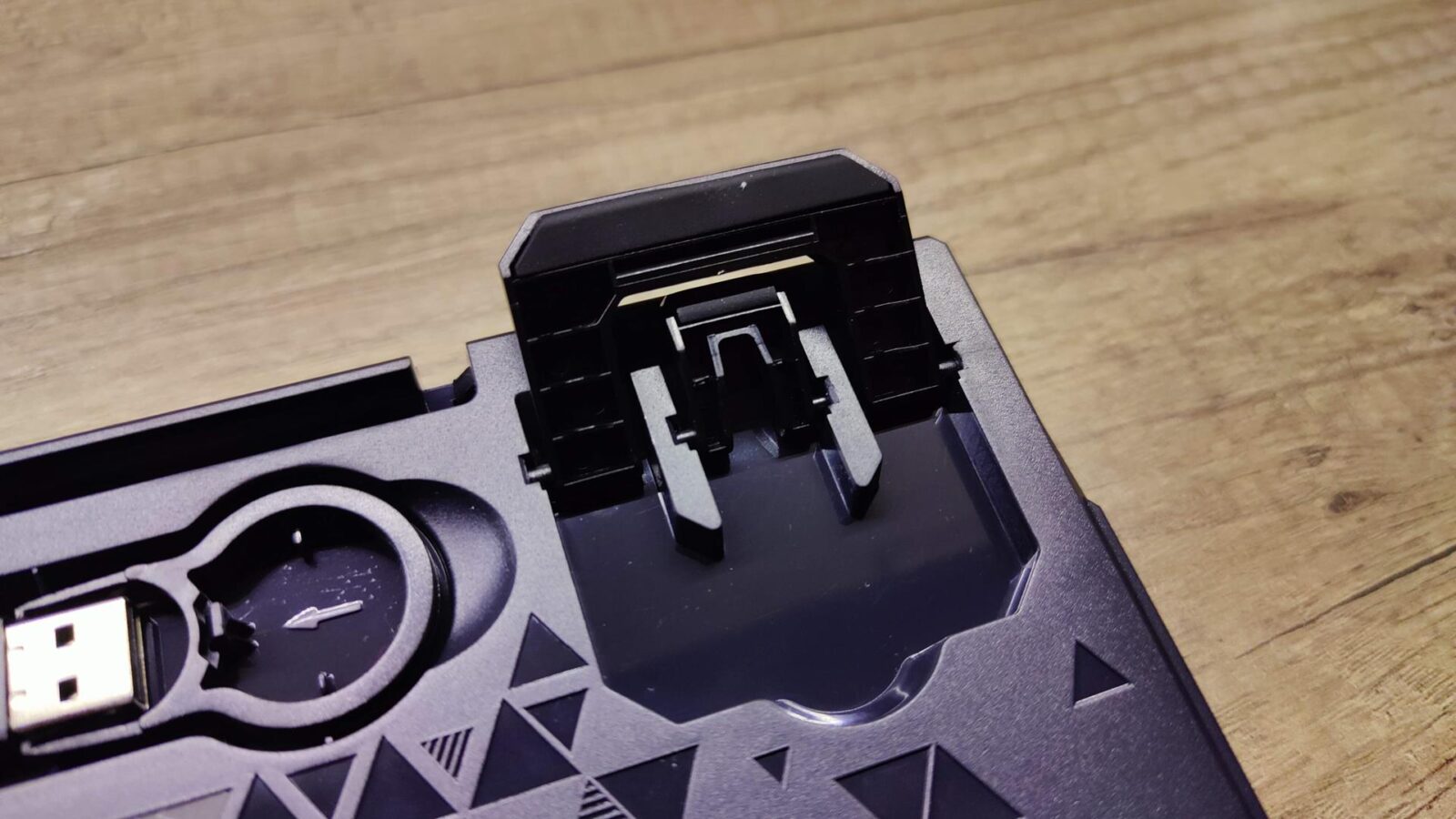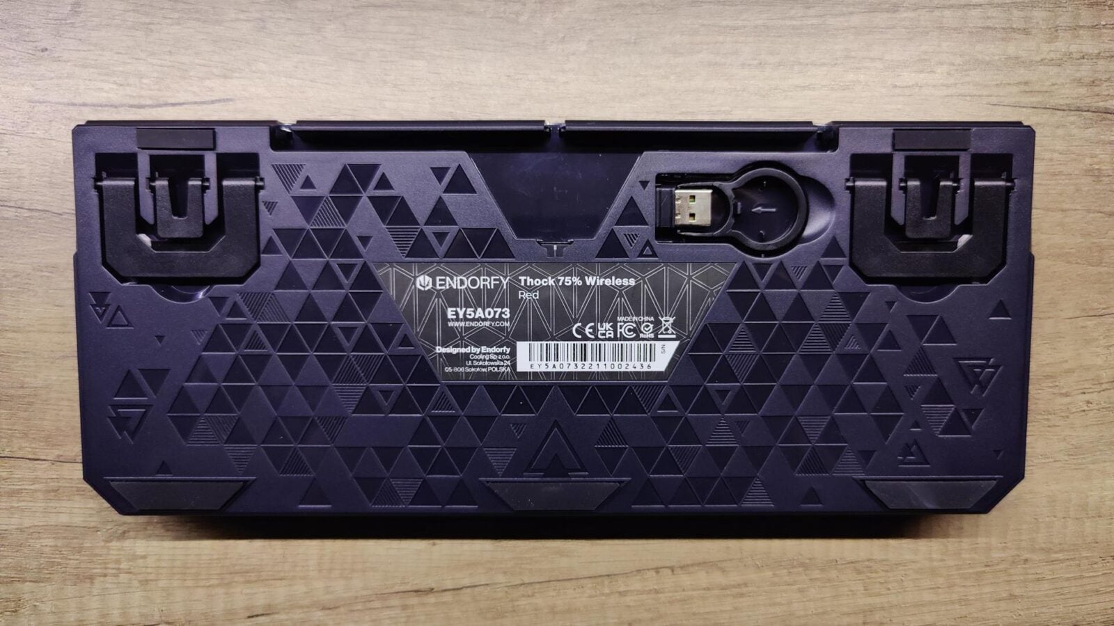 Na spodzie Endorfy zaszalał, zapewniając modelowi Thock 75% Wireless niecodzienny wygląd. Wśród szeregu przyciągających uwagę trójkącików znajdziemy kanaliki odprowadzające przewód w trzy strony, parę średniej wielkości gumowych podkładek na górnej części oraz trzy większe gumowe podkładki na tej dolnej. Poza tym producent postarał się o dwa zestawy solidnych nóżek o gumowym wyłożeniu oraz schowek nie tylko na ściągacz do keycapów, ale też na odbiornik USB-A dla trybu bezprzewodowego.
