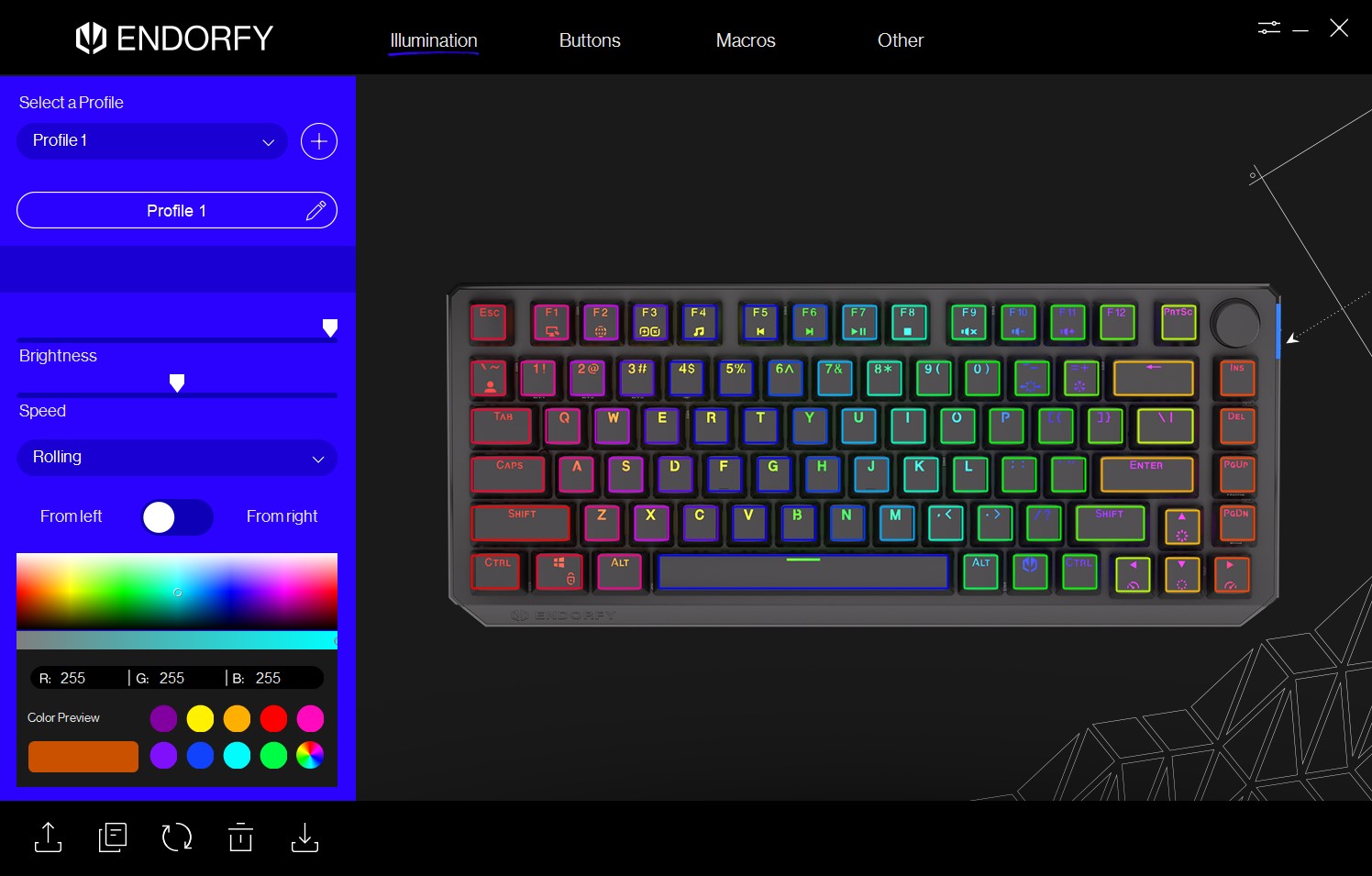 W aplikacji nie zabrakło również opcji dostosowywania podświetlenia. Producent oddał w nasze ręce całą masę różnych trybów, opcję dostosowywania efektu, natężenia jasności diod (5 poziomów od 0 do 100%) i kreacji własnego trybu. Jak wypada to w praktyce? Wręcz wzorowo, bo zaproponowana czcionka jest czytelna i dobrze wykrojona.