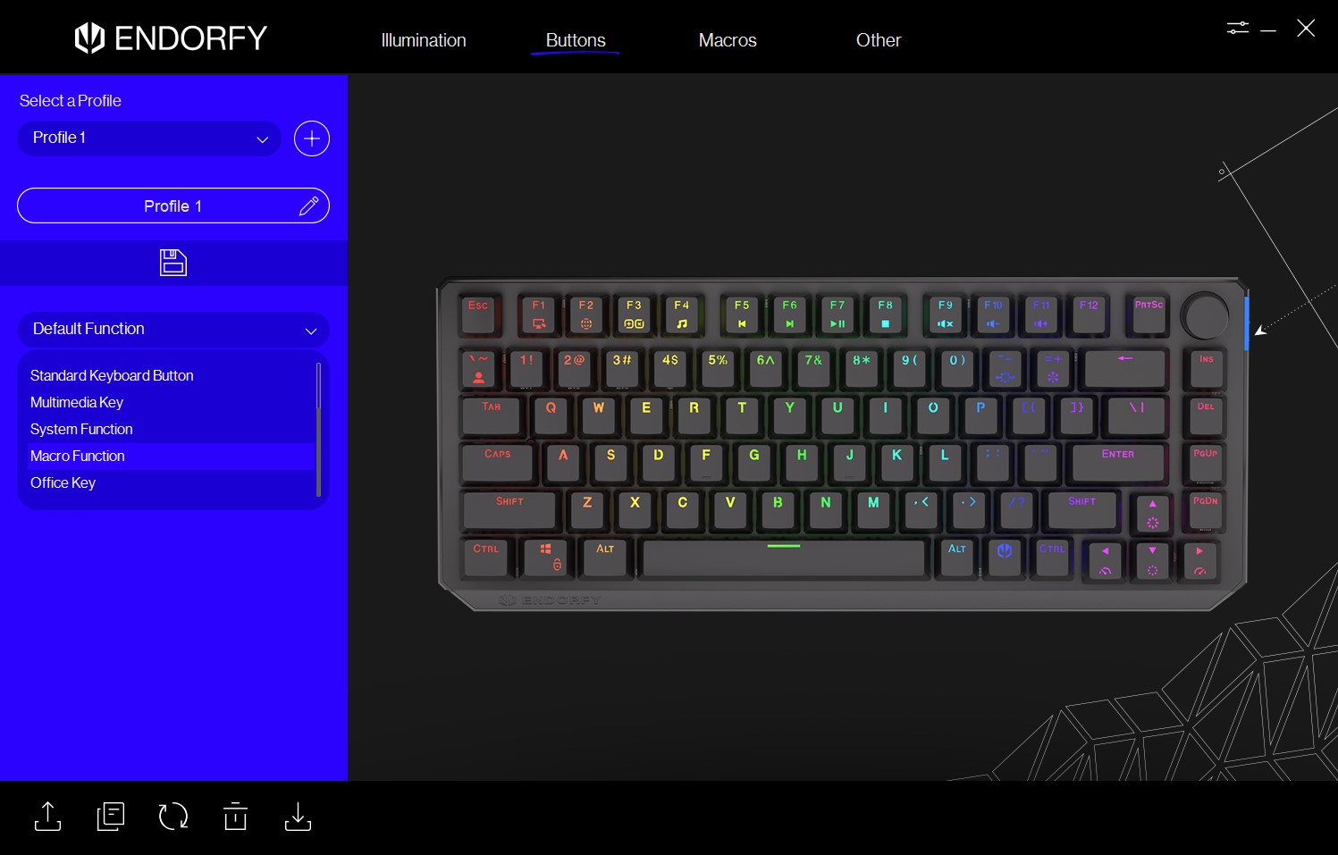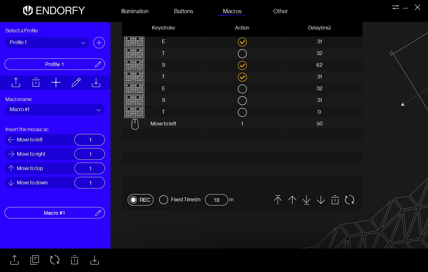 Jeśli już przy akumulatorze jesteśmy, warto wspomnieć, że ten ładuje się od alertu o niskim poziomie naładowania w około 90 minut a w trybie bezprzewodowym (Bluetooth) wytrzymuje do 14-16 godzin. Producent niestety nie postarał się o jakikolwiek wskaźnik dokładnego poziomu naładowania. Z kolei dostępna wyłącznie po podpięciu przewodu aplikacja klawiatury jest tradycyjna (zapewnia podstawowe opcje), a na dodatek stosunkowo przejrzysta, ale wyróżnia się jednocześnie na poletku tworzenia makr, które obejmuje nie tylko akcje przycisków klawiatury i myszki, ale też ruch kursorem w lewo, prawo, górę i dół o określoną liczbę punktów.