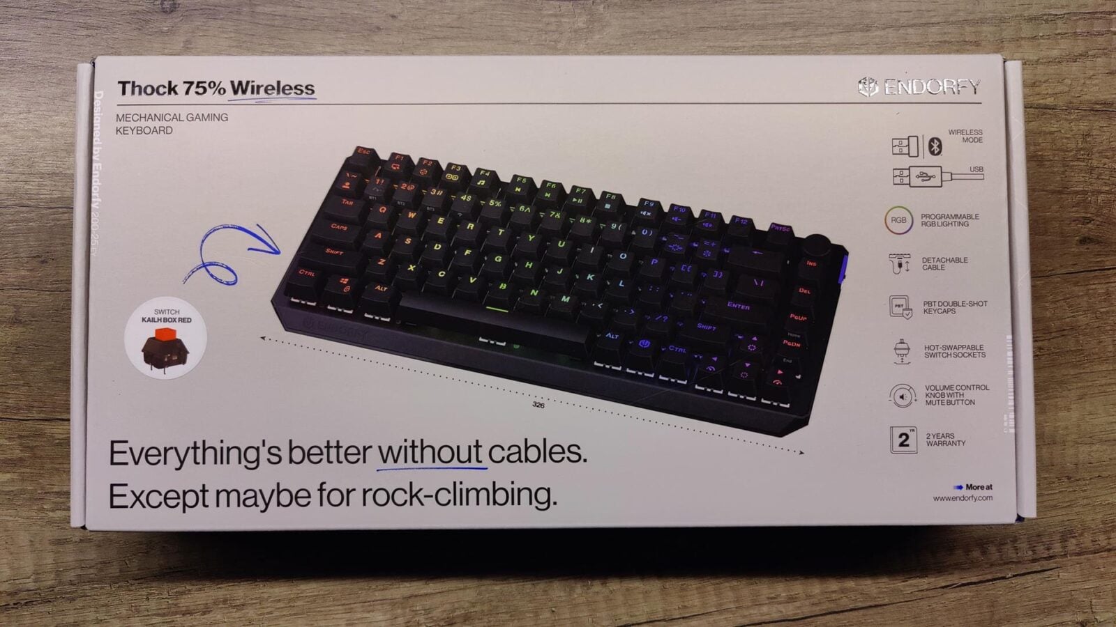 Endorfy Thock 75% Wireless nie zaskakuje specjalnie w pierwszych chwilach. Dociera do nas w tradycyjnym kartonowym pudełku w szarym kolorze, które przedstawia najważniejsze cechy modelu w prostym języku, pokazuje jej rendery niepasujące do fizycznego rozmiaru oraz bardziej szczegółowy opis m.in. w języku polskim.
