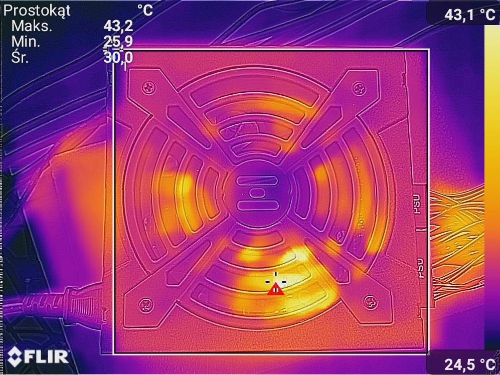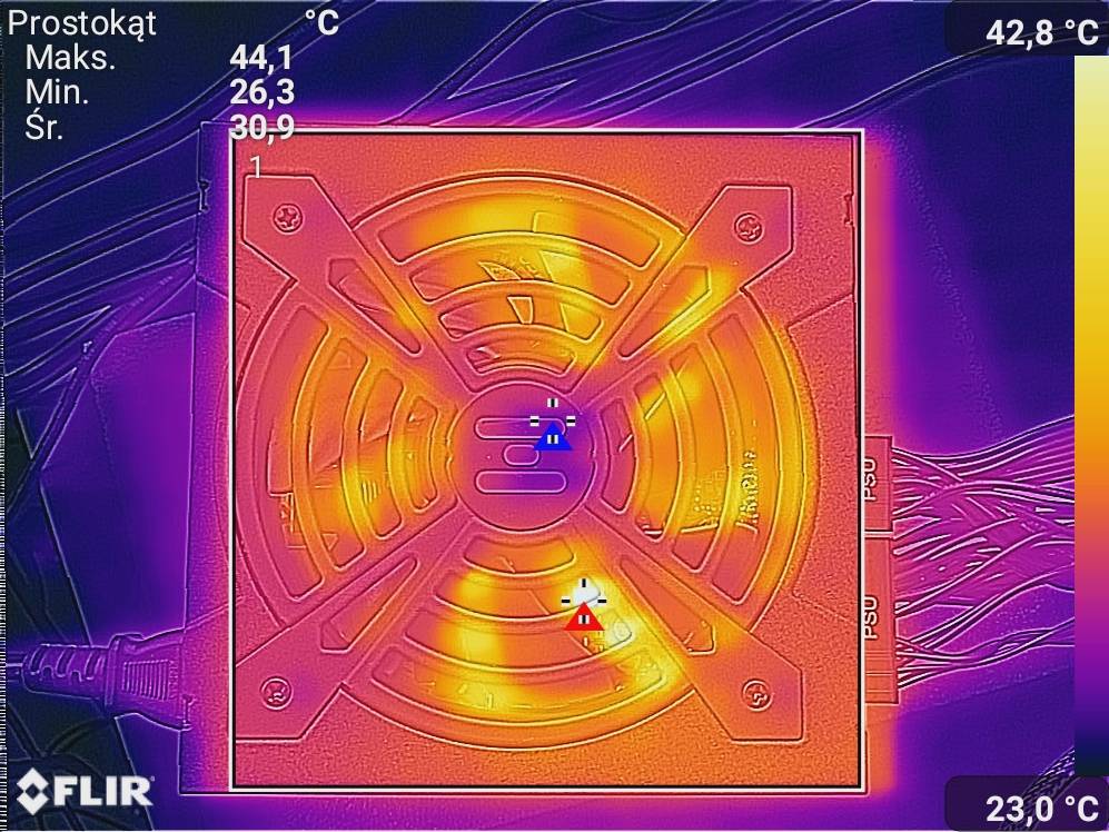Spoczynek to wyświetlanie tylko pulpitu. Obciążeniem był FurMark oraz Cinebench R23, a zasilacz pracował w trybie ECO. Zdjęcia termowizyjne wykonałem dzięki smartfonowi CAT S61.