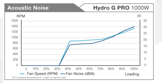 Zastosowany wentylator to MGA12012XF-O25 firmy Protechnic Electric. Jego maksymalne obroty mają wynosić ok. 1400 RPM, a głośność ma nie przekraczać 30 dBA. Warto tutaj tez pamiętać, że przy włączonym trybie ECO do 30% obciążenia całość będzie działała pasywnie. Wentylator to konstrukcja 120 mm i opiera się o łożysko FDB.