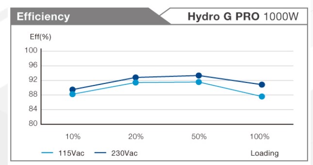FSP Hydro G Pro ATX3.0(PCIe5.0) 1000W ma certyfikat 80 Plus Gold. Jego sprawność w zależności od obciążenia dobrze pokazuje wykres poniżej: