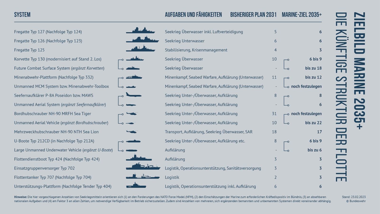 W celu realizacji tego celu marynarka wojenna Niemiec planuje pozyskać ponad 100 bezzałogowych systemów powietrznych (UAV) różnych typów i rozmiarów, które obejmą drony wszelakiej maści – od stałopłatowych po wirnikowe i na hybrydowych kończąc. Nie będą to jednocześnie zwyczajne UAV, a te wyspecjalizowane w konkretnych zadaniach. Niektóre z nich będą uzbrojone w rakiety lub torpedy, inne zapewnią zdolności w zakresie wywiadu, obserwacji oraz rozpoznania, a jeszcze inne będą realizować misje obejmujące wojnę elektroniczną.