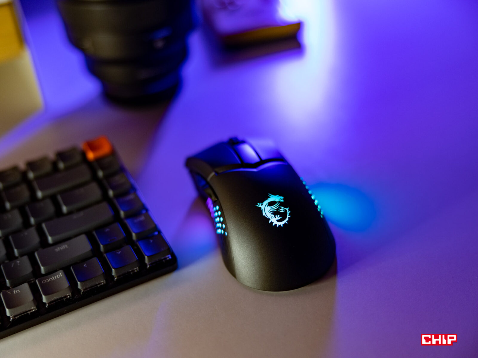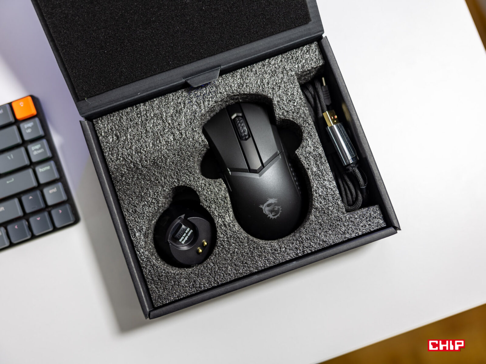 Jeśli jednak zależy wam na możliwie najwyższej wydajności ładowania i łączności, możecie zrezygnować z proponowanego przez MSI wpinania odbiornika do stacji ładującej i wpiąć go bezpośrednio w płytę główną. Wtedy odbiornik radiowy będzie działał “jak należy”, a stacja stanie się wyłącznie modułem ładującym. Samo ładowanie tej myszki jest imponujące, bo po wpięciu przewodu do USB generacji 3.0 (i powyżej lub po prostu ładowarki) aktywowany jest tryb przyspieszonego ładowania wbudowanego 600-mAh akumulatora, o czego konieczności przypomni wam migające na czerwono logo na grzbiecie myszki.