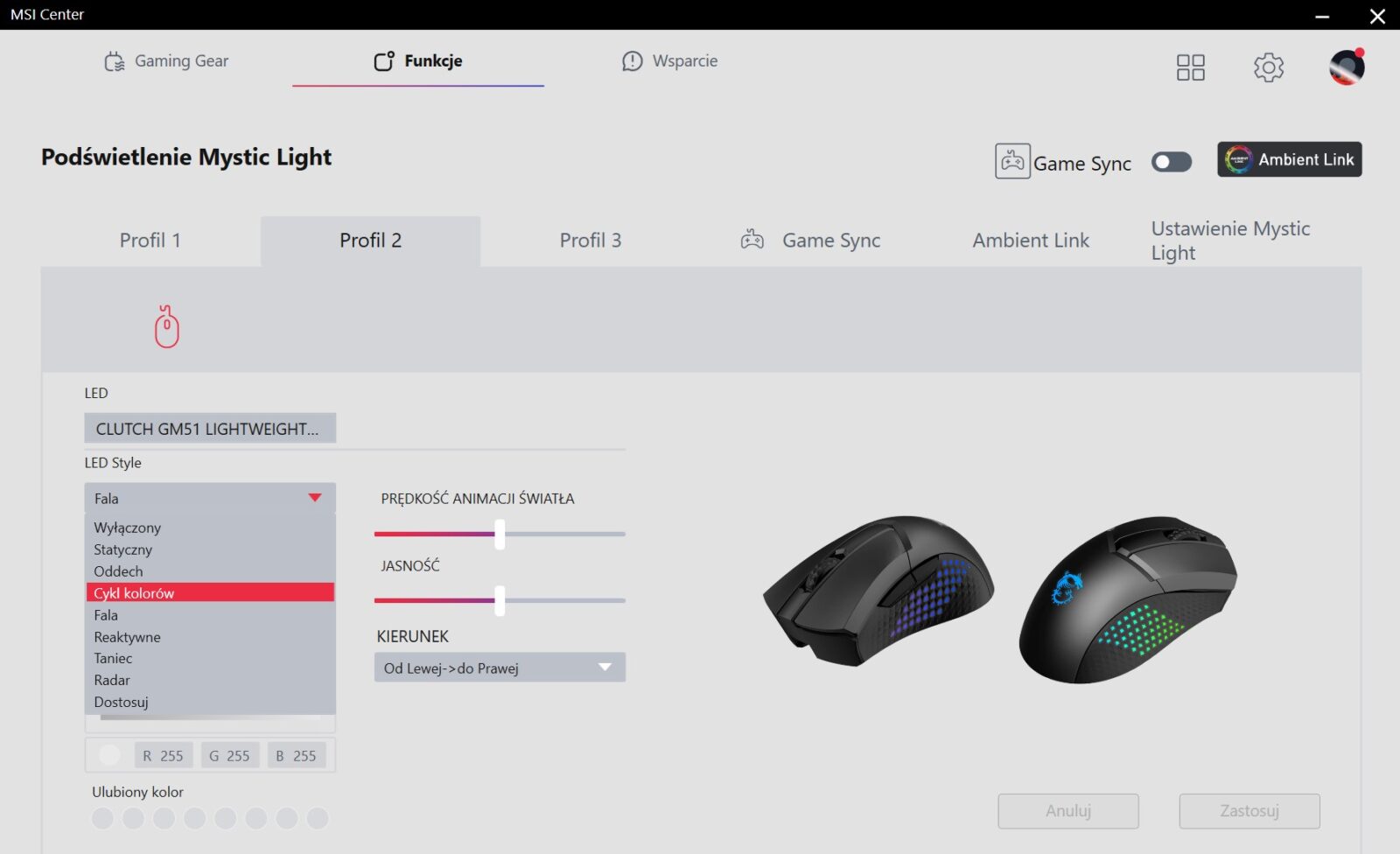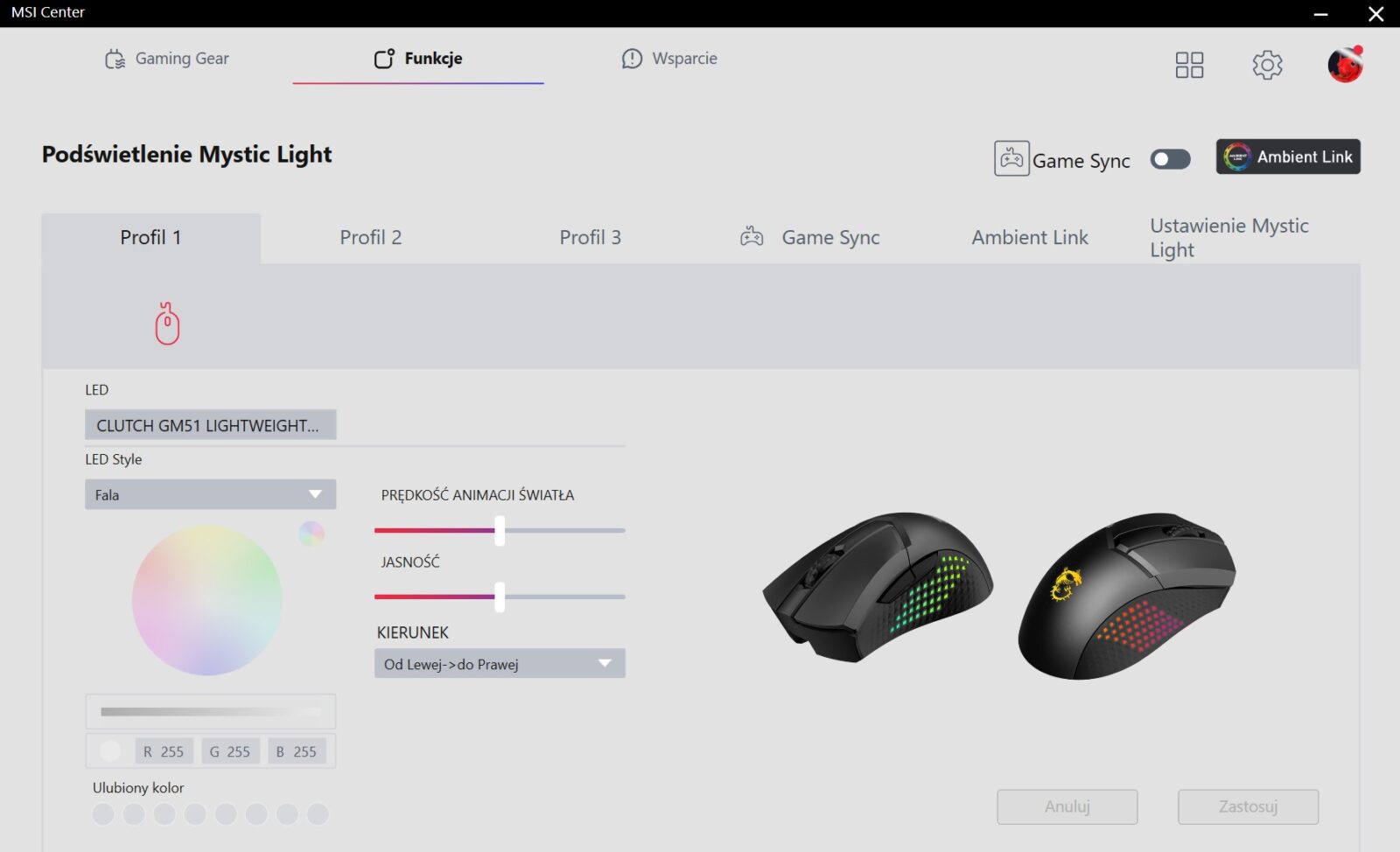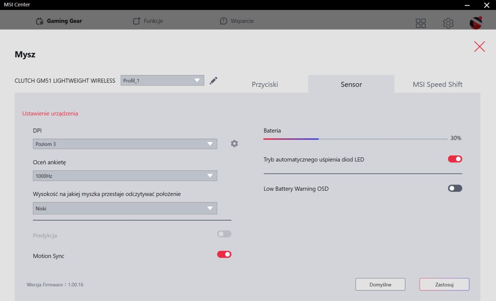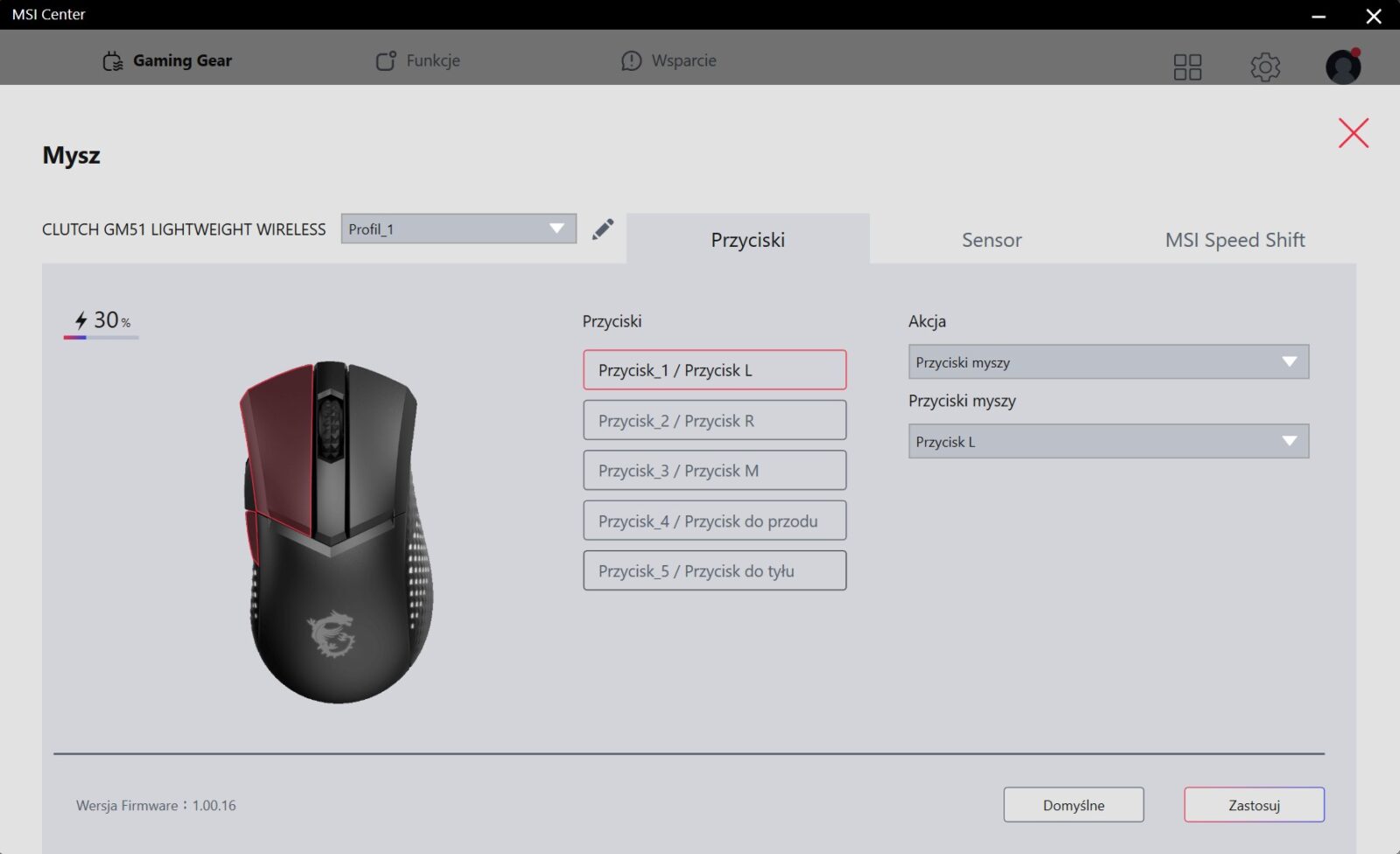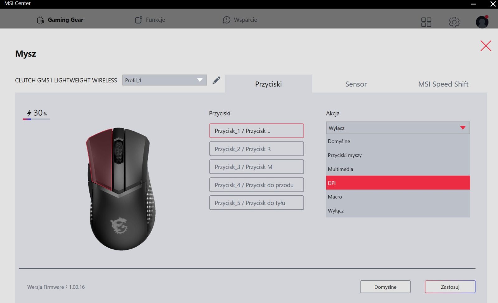 MSI rozwija aktualnie swoją aplikację, która naprawia wiele problemów wcześniejszej wersji (m.in. nie wymaga rejestracji), ale nadal daleko jej do ideału. W momencie pisania tego tekstu jest ona raczej uboga w funkcje (nie możemy nawet dostosować DPI, przez co jesteśmy skazani na odgórne poziomy), ale z drugiej strony pozwala m.in. zmienić funkcje przycisków, nagrać makra, zwiększyć czułość rolki i dostosować podświetlenie, więc oferuje ważną podstawę, która z pewnością rozwinie się z czasem.