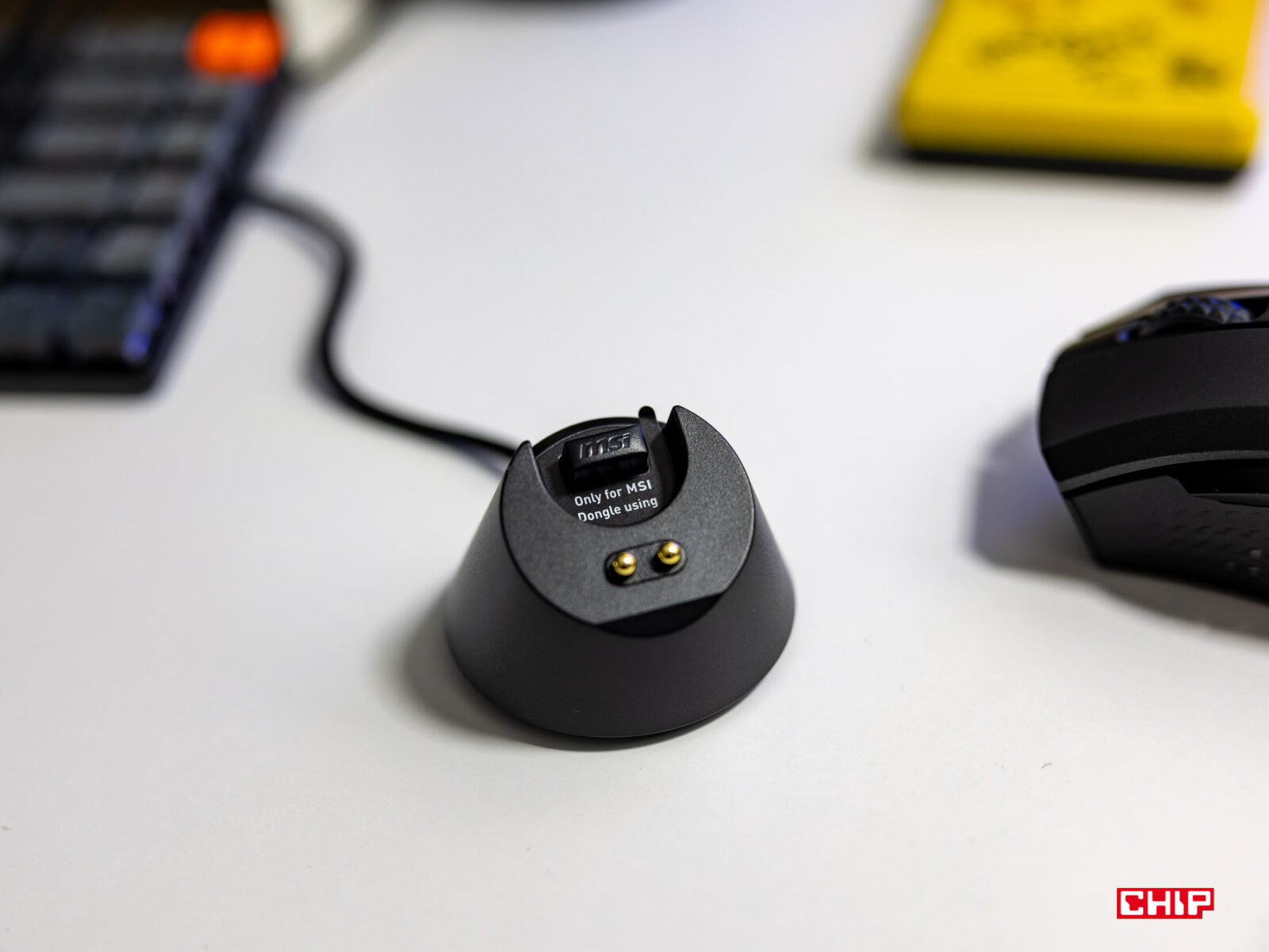 Zanim przejdziemy do samej myszki, warto zatrzymać się nad wspomnianym przewodem oraz stacją dokującą. Ten duet mówi bowiem jednoznacznie, jak powinniśmy korzystać z MSI Clutch GM51 Lightweight Wireless. Wprawdzie mysz może działać w trybie przewodowym, ale jego masywność (mimo zapewnień producenta, że jest to przewód “o zerowym tarciu” mówi jasno, że powinno to być dla nas ostatecznością.