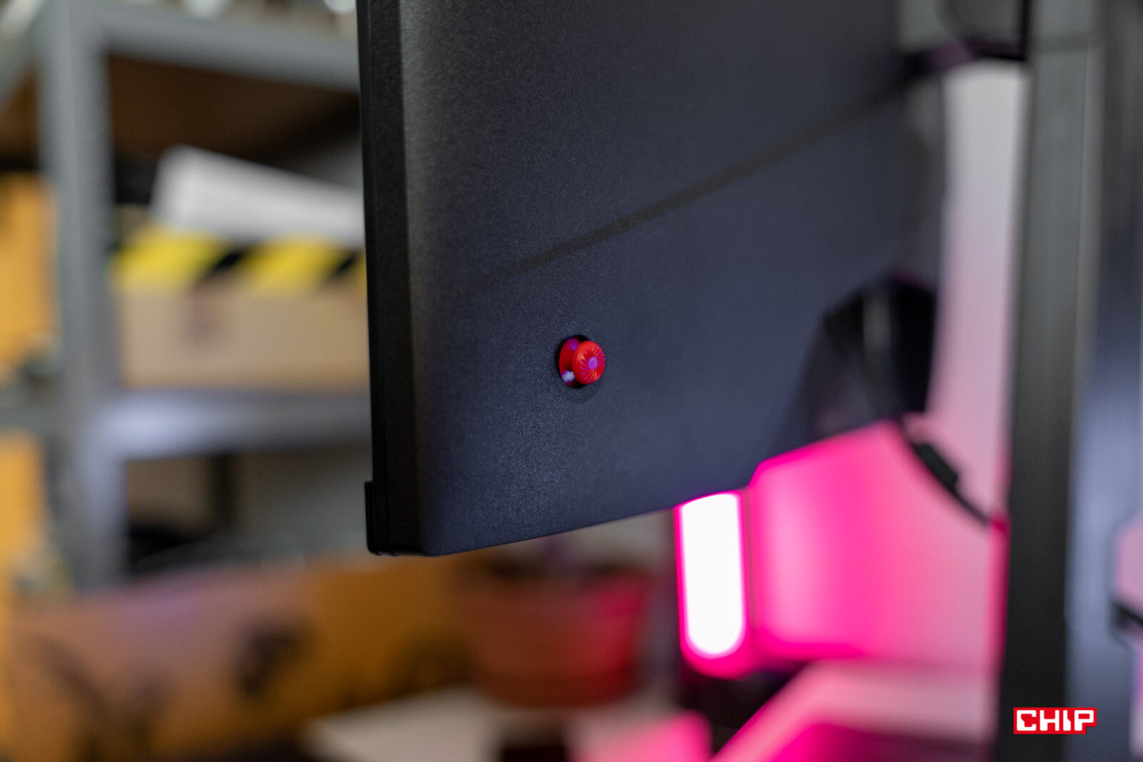 Do obsługi Menu monitora służy spory, czerwony dżojstik umieszczony na tyle obudowy. Początkowo wydawało mi się to niewygodne, ale szybko mnie do siebie przekonał. Obsługa monitora za pomocą jednego manipulatora jest prostsza i bardziej intuicyjna, niż kiedy mamy do dyspozycji kilka przycisków.