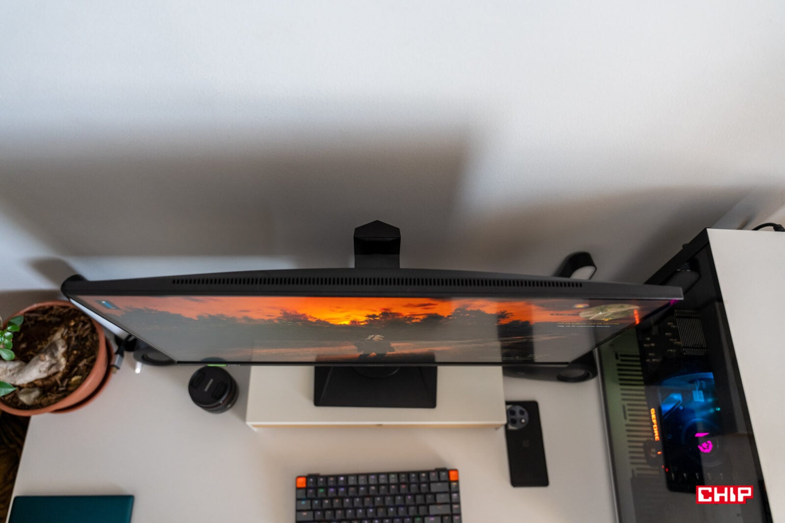 W złożeniu zestawu pomaga niska masa monitora (niewiele ponad 6 kg z podstawą), więc ustawienie go na biurku to bardzo prosta sprawa. Podstawa nie jest zbyt duża, a ekran jest zawieszony bezpośrednio nad nią, nie wystaje do przodu, wiec do postawienia monitora nie potrzebujemy głębokiego biurka.
