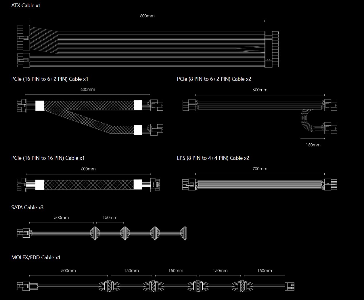 Okablowanie jest bardzo dobre i w zupełności wystarczy do złożenia komputera. Są dwa złącza 4+4-pin EPS czy łącznie 6 wtyczek PCI-E. Dwie z nich są w ramach dodatkowego kabla 12VHPWR, więc jeśli nie macie grafiki z taką wtyczką to i tak możecie wyjście z zasilacza wykorzystać. Nie mogło zabraknąć też zwykłego 600 W 12VHPWR. Oprócz kabli 12VHPWR okablowanie ma płaski profil, więc nie będzie problemów z ułożeniem wszystkiego w obudowie.