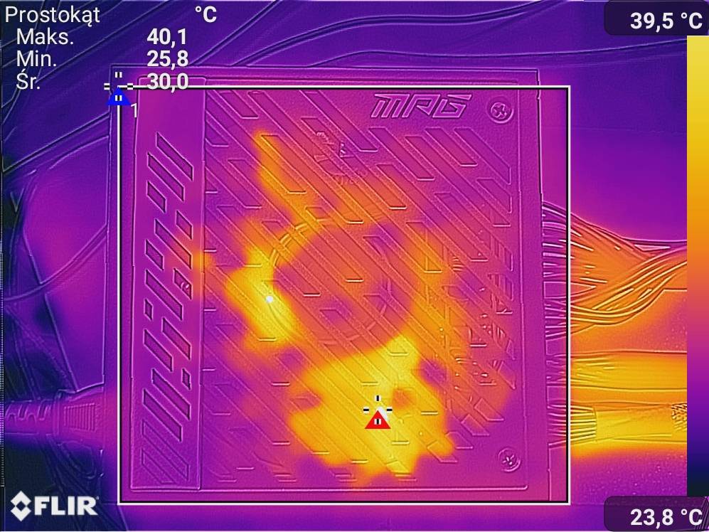 Spoczynek to wyświetlanie tylko pulpitu. Obciążeniem był FurMark oraz Cinebench R23, a zasilacz pracował w trybie Zero Fan. Zdjęcia termowizyjne wykonałem dzięki smartfonowi CAT S61.