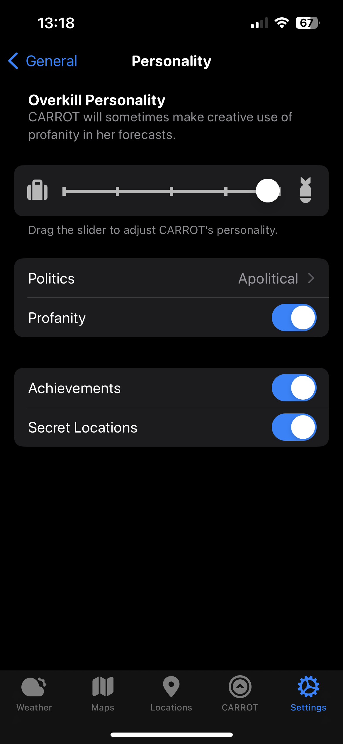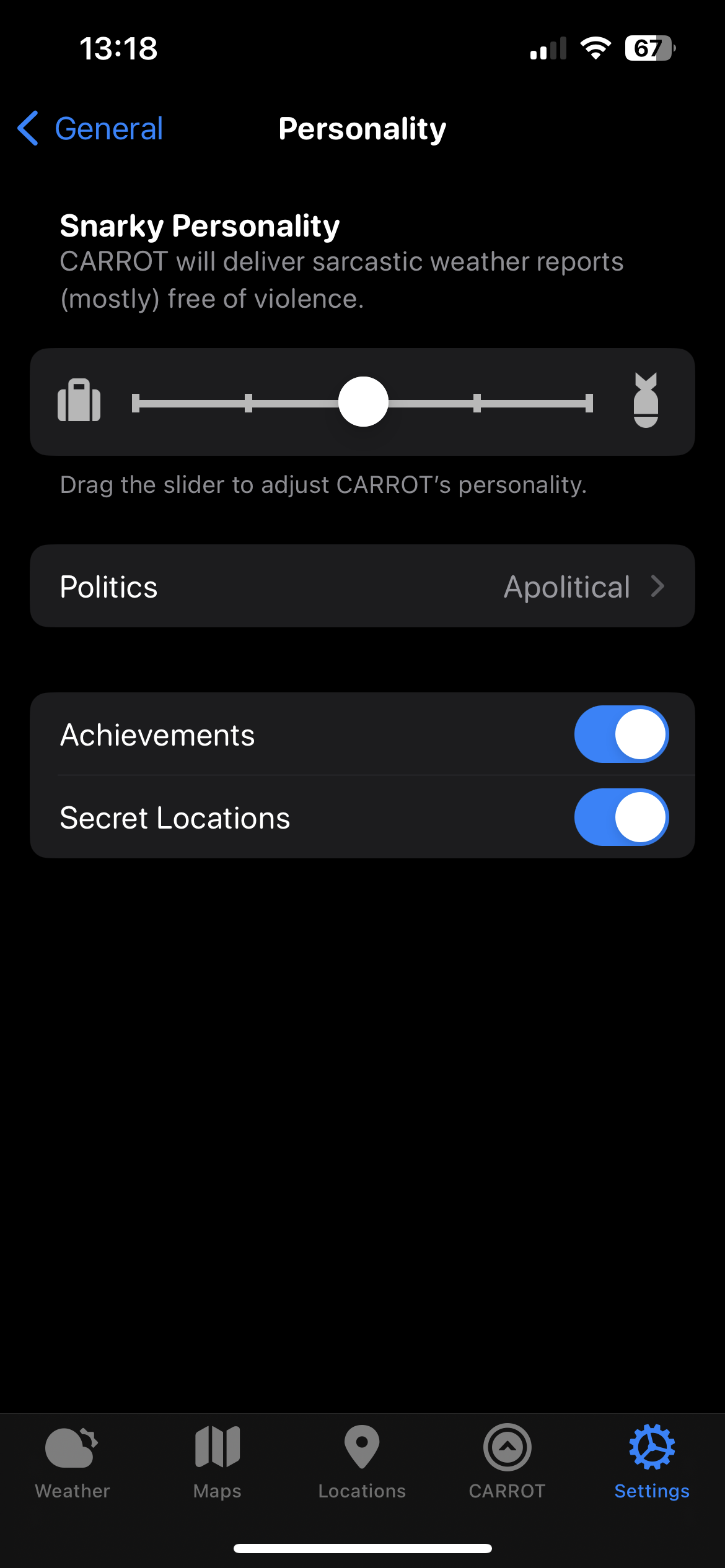 Jakie są to komentarze? To zależy – Carrot Weather ma 5 różnych osobowości do wyboru, od całkowicie profesjonalnej, do takiej, która potrafi skląć użytkownika, do tego osobno można zaznaczyć, czy wypowiedzi mają dotyczyć polityki, czy nie (tak czy owak, nie dotyczą polskiego piekiełka).
