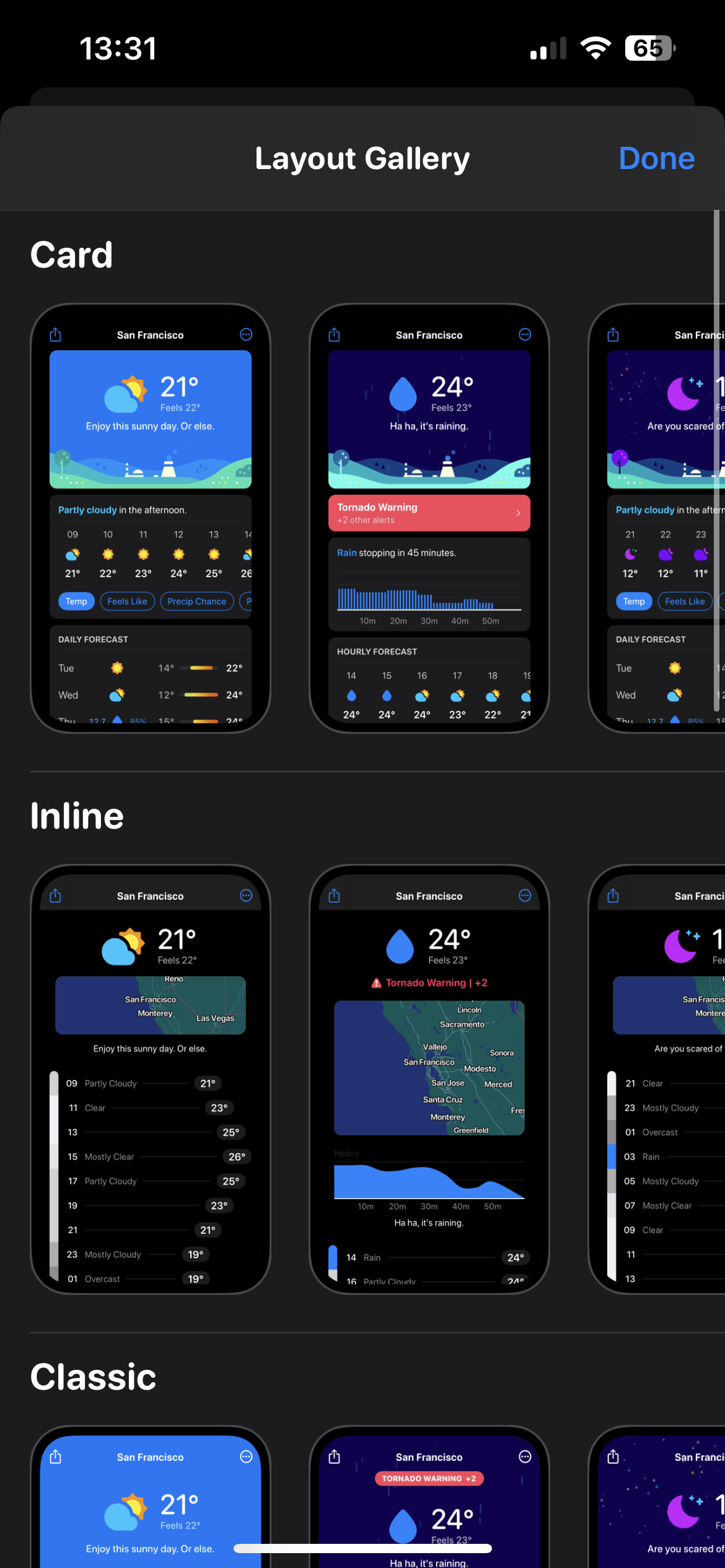 Dostosować do swoich potrzeb można także zestaw wyświetlanych kart z danymi oraz dostawcę danych pogodowych – domyślnie jest to Apple Weather, lecz do wyboru jest aż 9 źródeł, w tym należący do Apple Dark Sky, który zapewne w niedalekiej przyszłości zostanie wyłączony i całkowicie zastąpiony przez Apple Weather. Dla użytkowników w Polsce najdokładniejsze będą zapewne dane z serwisów Foreca i Meteogroup, przy czym wybór tego pierwszego pozwoli także na minutowe przewidywanie opadów.