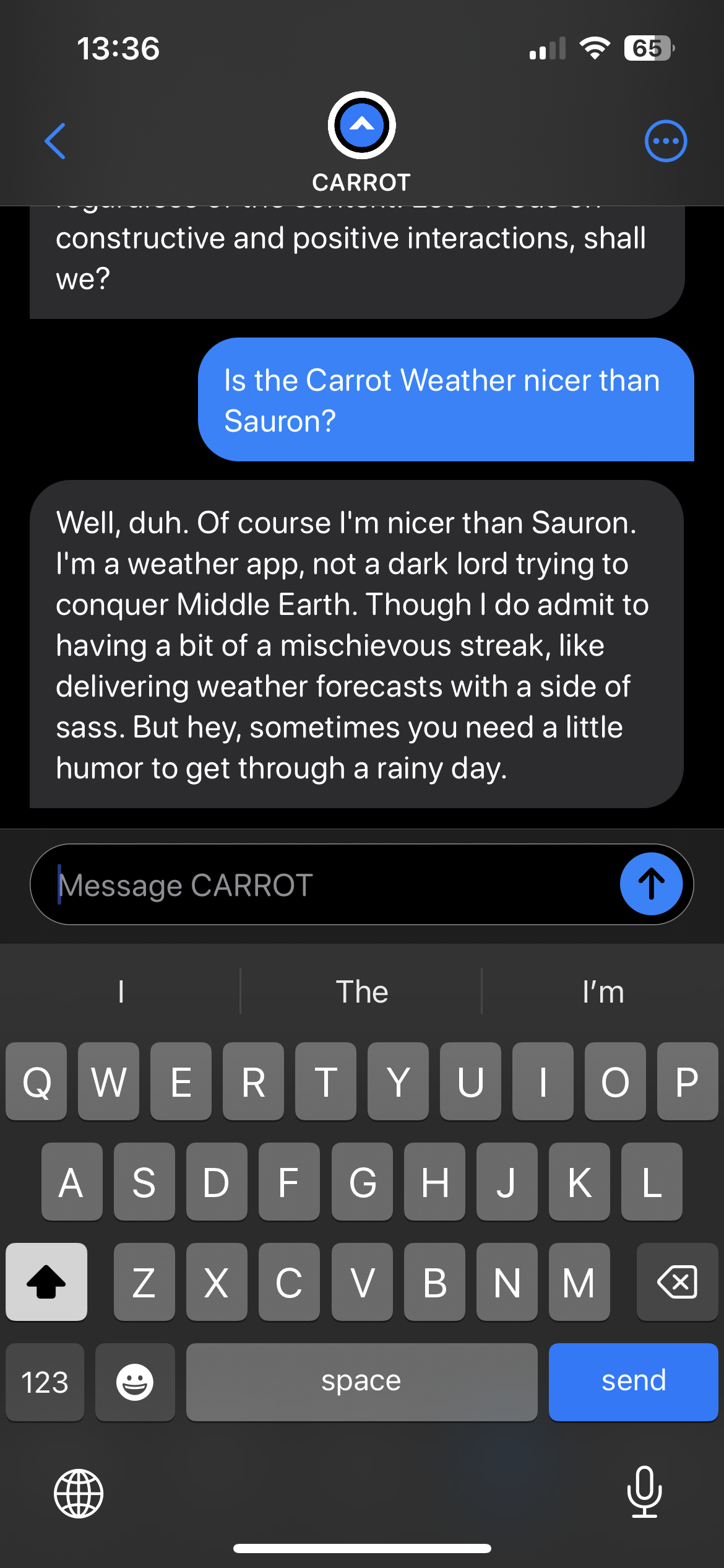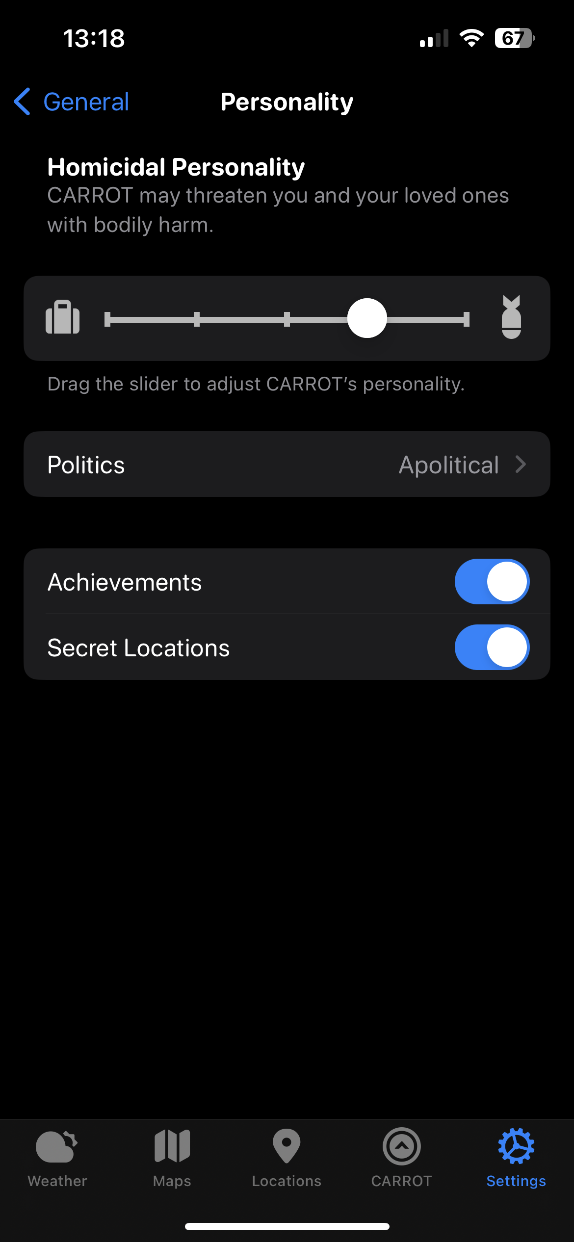 Carrot Weather ma też parę funkcji, które zupełnie nie są związane z pogodą – takich jak zabawa w wyszukiwanie miejsc na mapie, nawiązanie bliższych reakcji z Carrotem (nie bez powodu jedno z osiągnięć to „love is in the air” czy też pogawędka z nim z pomocą jeszcze lśniącego nowością ChatGPT – połączenie sarkastycznej „osobowości” z możliwościami formułowania wypowiedzi zapewnianymi przez ten silnik więcej niż kilka razy spowodowało szeroki uśmiech na twarzy. Krótko mówiąc, pomysłodawca programu robi wszystko, by chcieć zaglądać do niego jak najczęściej i nie tylko w celu uzyskania najświeższej prognozy pogody.