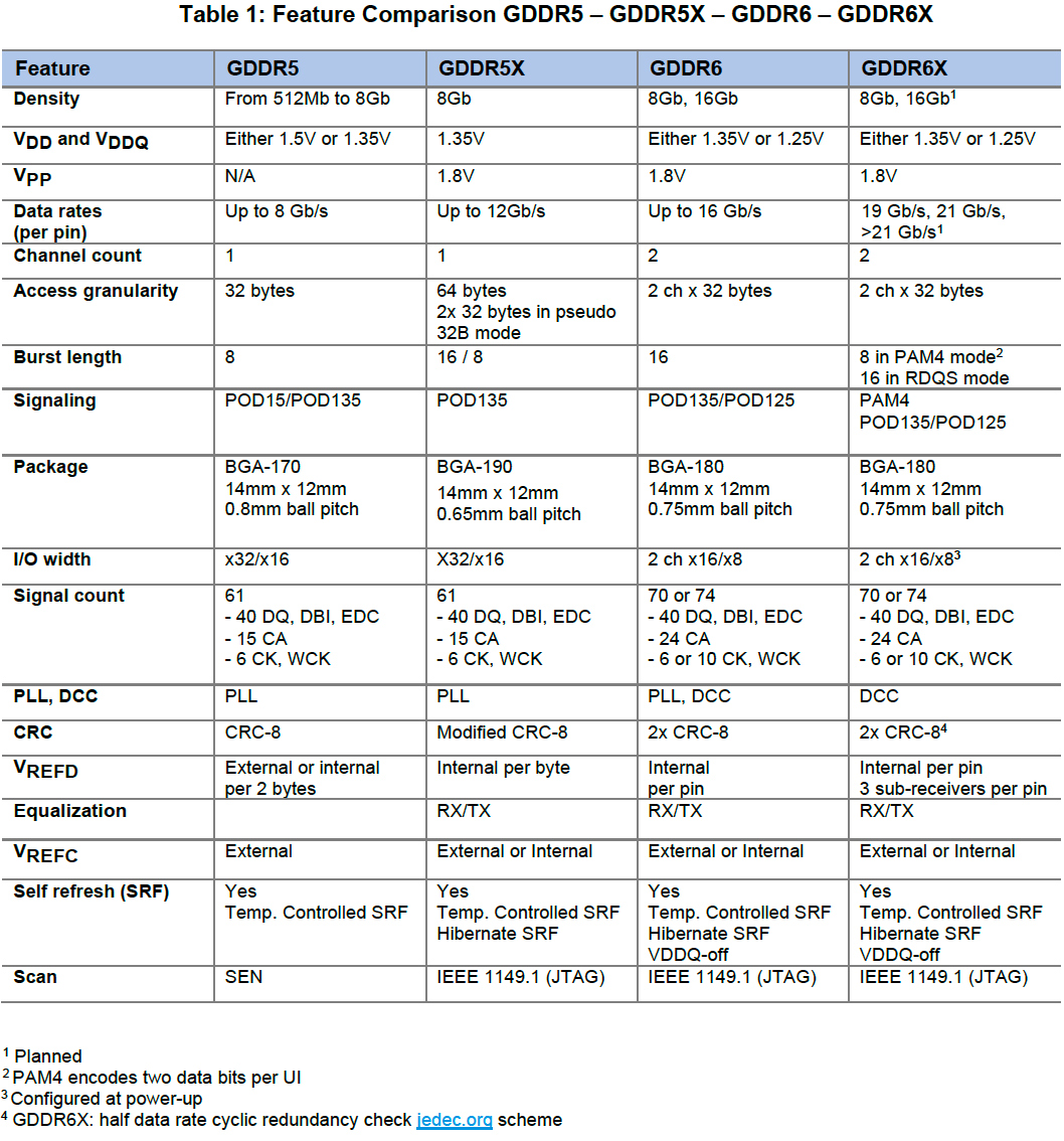 Aktualnie najwydajniejszymi układami VRAM standardu GDDR są pamięci GDDR6X o szybkości 24 Gb/s i pojemności 2 GB, które pracują na napięciu 1,35 V. Standard GDDR7 będzie od nich znacznie wydajniejszy, oferując ogólnie wyższą przepustowość i pojemność oraz niższe zużycie energii niż GDDR6X. Będzie wykorzystywać kodowanie PAM3, które zmniejszy ogólne zużycie energii o 20% i umożliwia przesyłanie trzech bitów danych na symbol zamiast dwóch, dzięki czemu osiągnie 36 Gb/s danych na pin przy częstotliwości zegara 12 GHz, w porównaniu do 21 Gb/s osiągalnym przy zegarze 10,5 GHz przez GDDR6X. W toku rozwoju GDDR7 jej wydajność wzrośnie do aż 50 Gb/s.