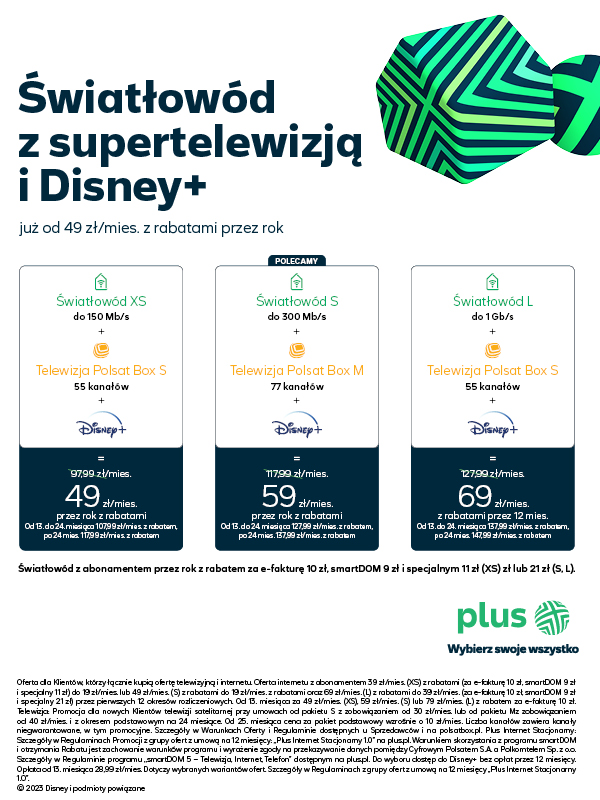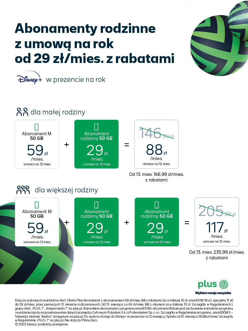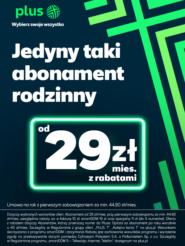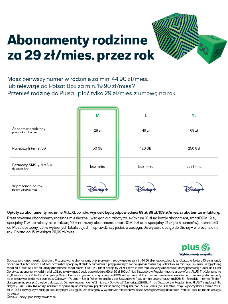 Natomiast jeśli interesuje was rodzinny abonament i tutaj pojawiły się nowe opcje. Dobierając kolejny abonament już za 29 zł miesięcznie na rok. W ramach tej opcji dostajemy 50 GB miesięcznie, natomiast podwyższając abonament do 49 lub 69 zł miesięcznie można dostać odpowiednio 120 lub 250 GB internetu do wykorzystania każdego miesiąca. W tych trzech opcjach abonamentowych Plus dorzuca również darmowy roczny dostęp do Disney+. Należy jednak pamiętać, że takie ceny będą obowiązywać przez rok, po upływie 12 miesięcy miesięczny koszt każdego z abonamentów wzrośnie o 40 zł, przechodząc jednocześnie na czas nieokreślony.