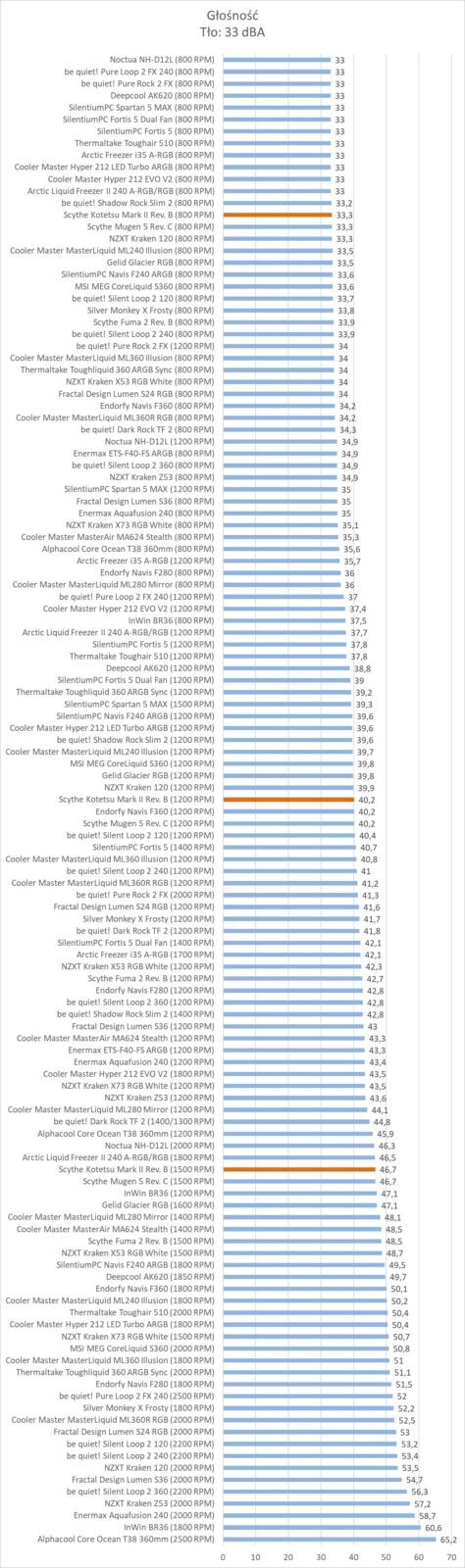 Na 1500 RPM chłodzenie będzie słyszalne i tutaj może przeszkadzać przy cichszych zestawach. Przy 1200 RPM jest już lepiej, a przy 800 RPM mamy prawie idealna ciszę. Szkoda więc, że na wyższych obrotach nie jest ciszej, bo konkurencja tutaj potrafi lepiej wypadać.
