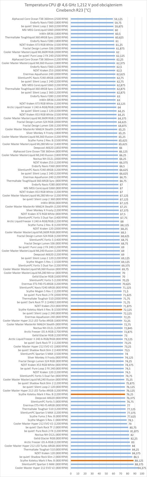 Wydajność na wszystkich obrotach jest bardzo fajna jak na taką konstrukcję. Chłodzenie dało sobie radę z procesorem nawet przy 800 RPM, co jest dobrym wynikiem. Na maksymalnych obrotach i 1200 RPM jest na poziomie podobnych konstrukcji, które mają dwa wentylatory. Po OC procesora chłodzenie już nie radzi sobie i temperatury sięgają 100°C, ale jest to standard przy takich konstrukcjach.