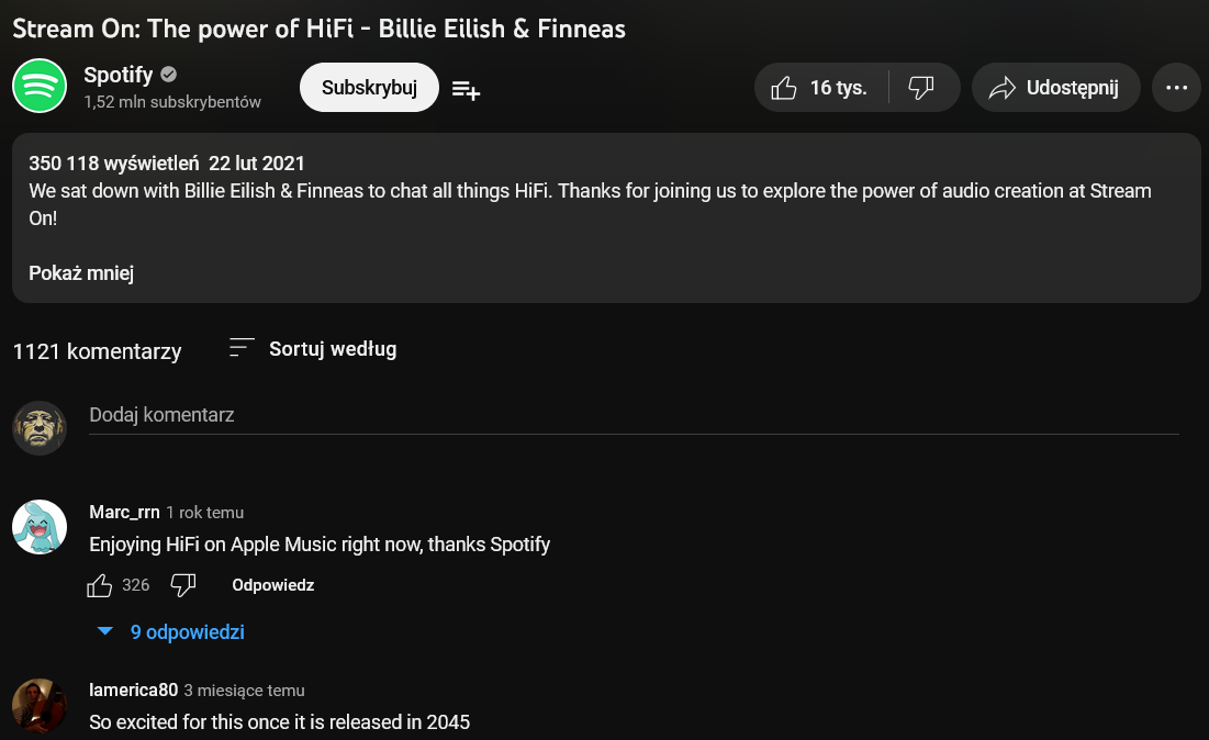 Odszukałem na kanale Spotify w serwisie YouTubie promocyjny klip z lutego 2021 roku, w którym występują wspólnie Billie Eilish i Finneas. Obydwoje artystów rozpływa się nad istotą dźwięku wysokiej jakości i tym, jak ważne to dla nich oraz potencjalnych odbiorców ich twórczości. Niebywale rozbawiły mnie dwa komentarze pod filmem, które zyskały najwięcej polubień i wskoczyły przez to najwyżej do domyślnego widoku.