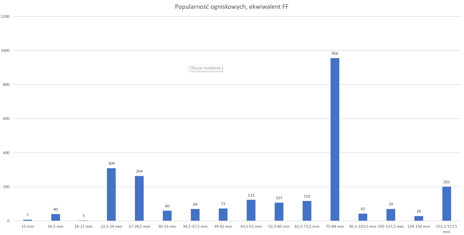Tabelka i wykres są oparte o konkretny zbiór danych z mojego własnego podwórka i w zasadzie na pewno można by powiedzieć, że u kogoś innego będą wyglądać zupełnie inaczej. A jednak wydaje mi się, że zbieżność z popularnymi w smartfonach ogniskowymi nie jest zupełnie przypadkowa, nawet jeśli wiadomo, że najbardziej w urządzeniach mobilnych jest dopieszczony aparat szerokokątny – producenci mają swoje badania zrobione na dużo bardziej zróżnicowanym i bogatszym zbiorze danych i jeśli księgowy nie przytnie entuzjazmu, czasem wzbogacą go o to, co rzeczywiście ma szansę być przydatne. Czego sobie i państwu życzę.