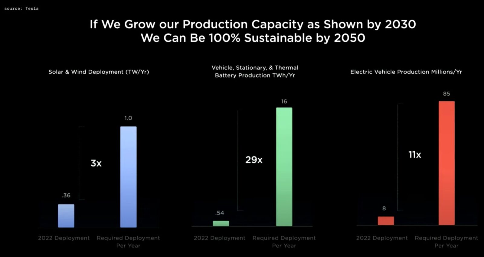 Jak na firmę motoryzacyjną, podczas Investor Day o samochodach mówiono bardzo niewiele. Są one jedynie niewielkim elementem układanki w planie Tesli, wyrażonym liczbami jako 21% udziałów w planie eliminacji paliw kopalnych. Warto tu wspomnieć, że wielkim nieobecnym tego Investor Day był nowy model samochodu, prawdopodobnie Tesla Model 2, o którym dowiedzieliśmy się tylko kilku kluczowych informacji, bez żadnych konkretów: