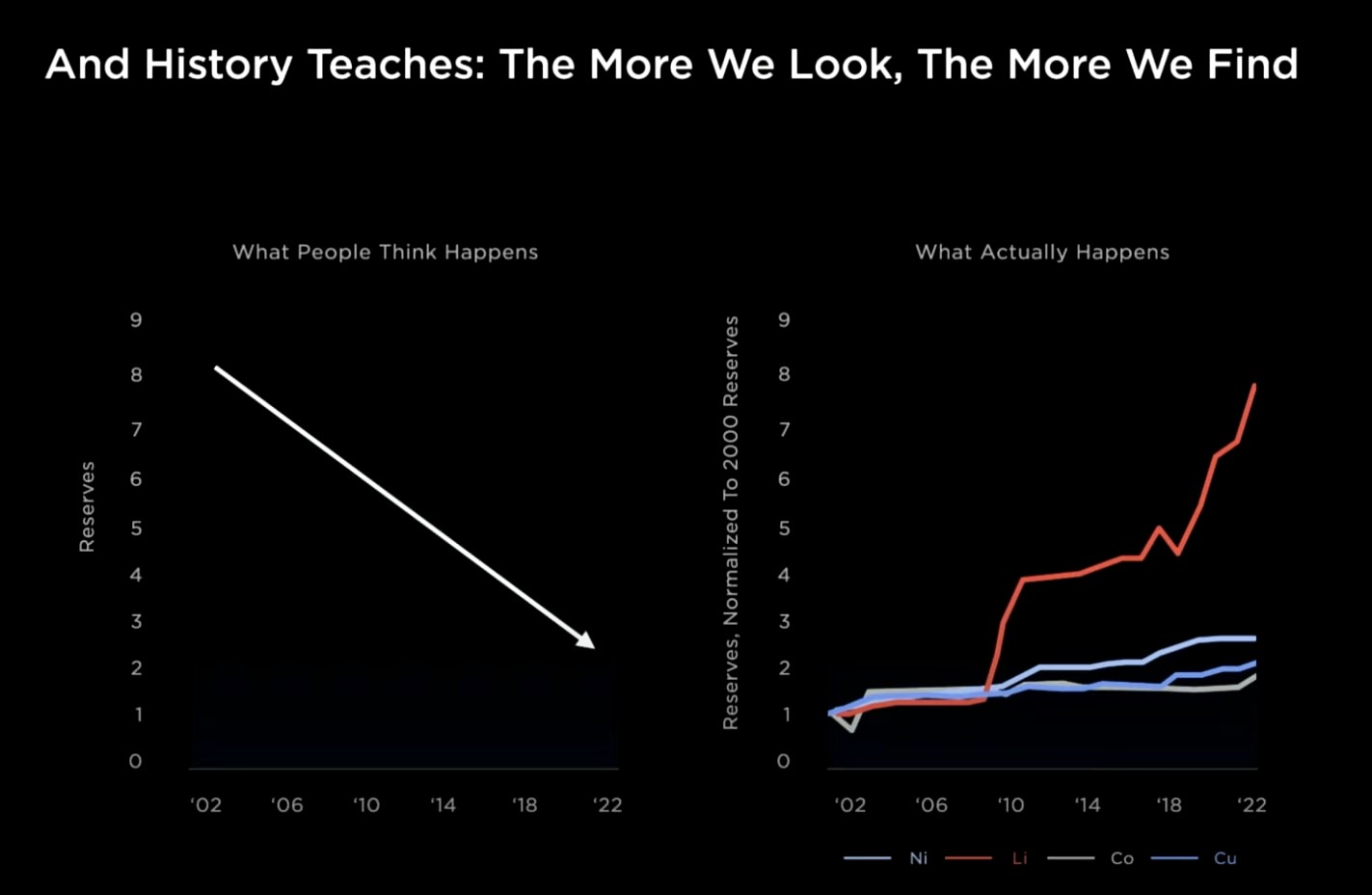 „Im więcej szukamy, tym więcej znajdujemy” – padło ze sceny, odnosząc się do konieczności dalszego wydobywania pierwiastków, w tym metali ziem rzadkich. O ile Masterplan Tesli ma przynieść redukcję wydobycia oraz raptowny wzrost recyclingu, tak zapotrzebowanie na pewne pierwiastki – szczególnie Nikiel i Lit – nie zmaleje w istotnym stopniu. Tesla jednak bardzo optymistycznie zakłada, że zasoby tych pierwiastków nie tylko się nie skończą, ale wręcz… będzie ich przybywać, bo stale znajdowane są nowe, nieodkryte dotąd złoża, a też rośnie ilość pierwiastków pozyskiwanych wtórnie.