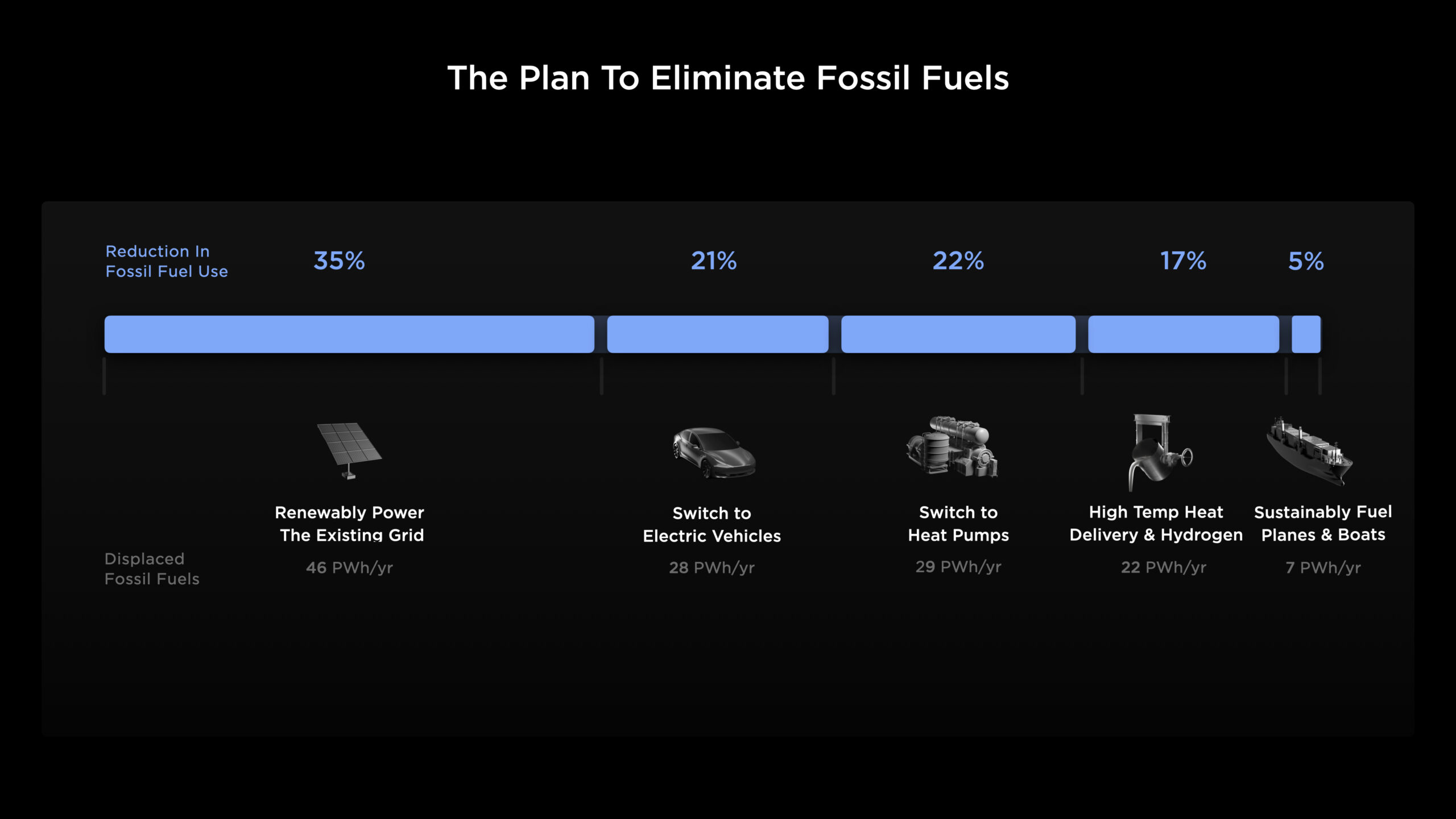 Masterplan 3 zakłada przede wszystkim trzy filary redukcji wykorzystania paliw kopalnych: wspomniane przejście na odnawialne źródła energii, ze szczególnym uwzględnieniem paneli słonecznych, przesiadkę na samochody elektryczne oraz przejście na pompy ciepła. W kolejnych etapach dojść ma poprawa jakości przesyłu i magazynowania energii oraz (fragmentarycznie) zielonego wodoru, zaś na samym końcu Tesla wspomina o zrównoważonych paliwach dla transportu powietrznego i morskiego, którego prawdopodobnie nigdy nie uda się w całości przestawić na zasilanie odnawialnymi źródłami energii.