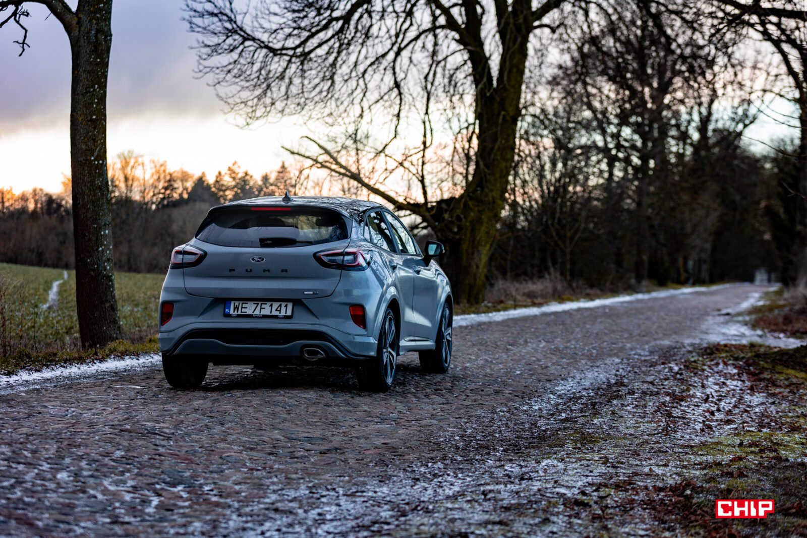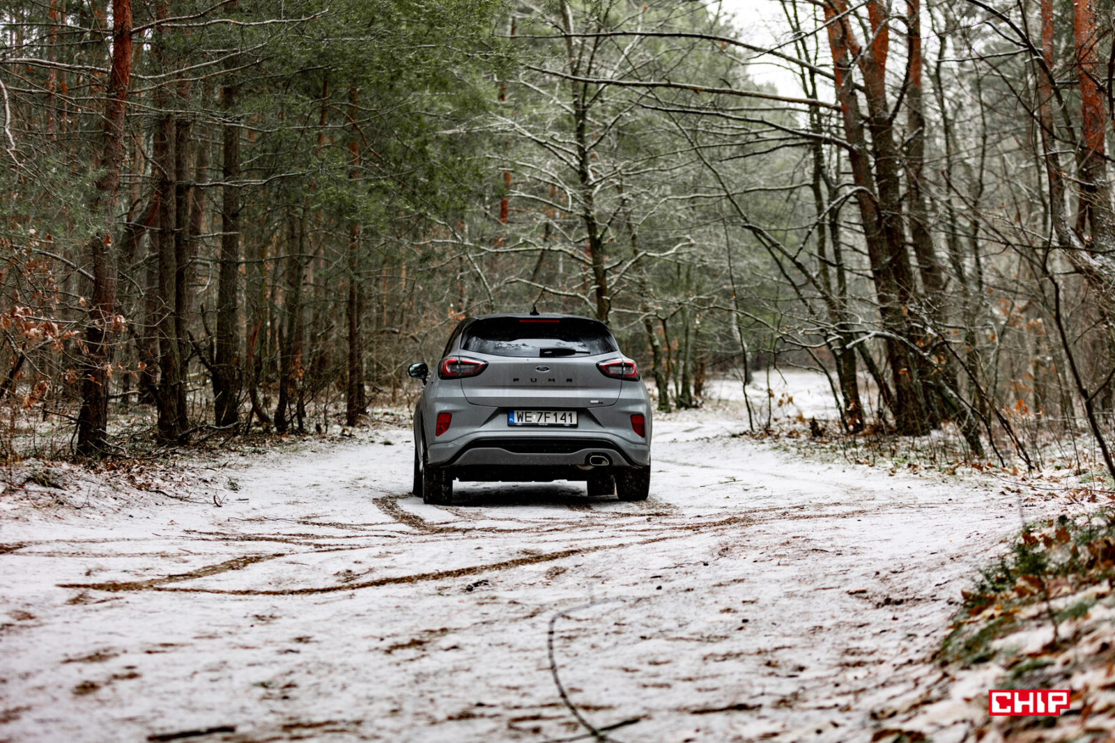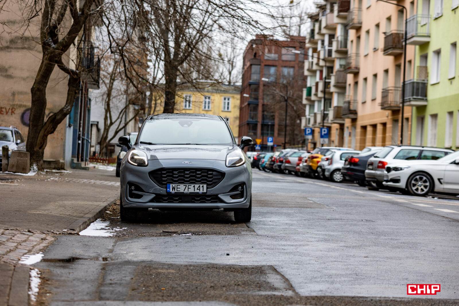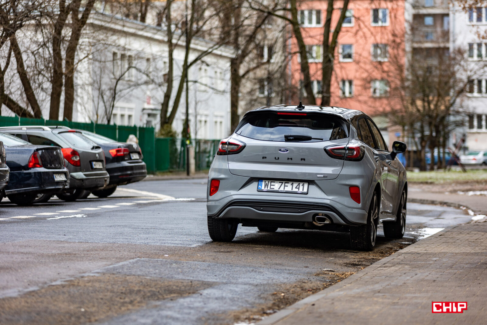 Co prawda dawno już żadnego auta nie testowaliśmy w tak parszywych warunkach pogodowych, ale też nie kojarzę innego modelu, który brudziłby się tak mocno jak Ford Puma. Mowa o trzech elementach – lampach, przedniej szybie i kamerze cofania. W przypadku lamp jest to pewnie kwestia ich umieszczenia i kształtu. Przednia szyba jest dosyć mocno nachylona i stosunkowo nieduża, więc wycieraczki nie są w stanie objąć większej powierzchni, a kamera cofania jest nad tablicą rejestracyjną. Inne samochody też się brudzą, ale przednia szyba i lampy Pumy dosłownie kilkadziesiąt kilometrów po wyjeździe z myjni wyglądały jak po przejeździe zabłoconą, polną drogą. To nie jest auto dla pedantów.