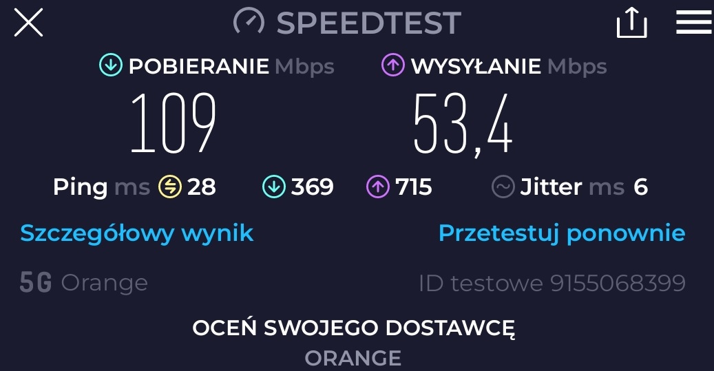 W temacie wyposażenia Samsung Galaxy A54 5G prezentuje się lepiej niż dobrze. Dostajemy obsługę sieci 5G i to na dobrym poziomie. W 10 próbach w programie Speedtest w sieci Orange uzyskałem maksymalnie 109 Mb/s w przypadku pobierania danych oraz 53,4 Mb/s przy ich wysyłaniu. Nieźle, ale jest to wynik uzyskany w samym centrum Warszawy. W domu (i nie tylko) możemy skorzystać również z Wi-Fi w paśmie 2,4 i 5 GHz. Przez cały okres testów nie odnotowałem najmniejszych problemów ze stabilnością połączenia.