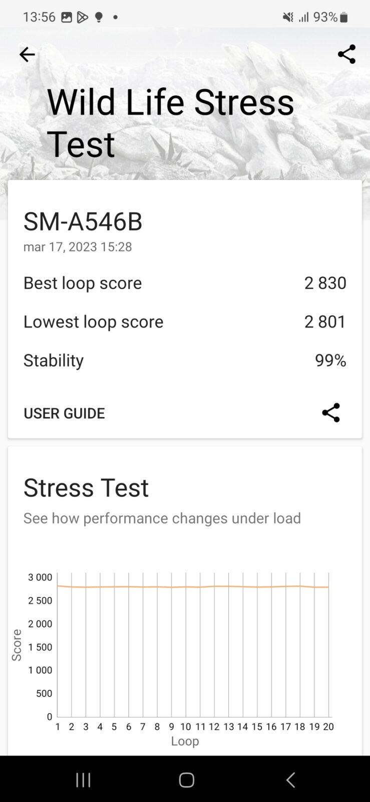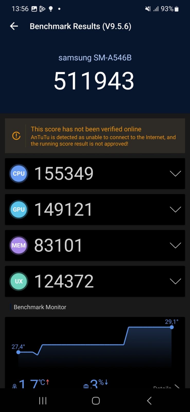 W codziennym użytkowaniu smartfon działa płynnie i stabilnie, a co ważne – obudowa nie osiąga wysokich temperatur nawet podczas długiego grania w gry. Wydajność również nie spada, co potwierdzają syntetyczne stress testy, w których Samsung Galaxy A54 5G osiąga aż 99% stabilności osiągów.
