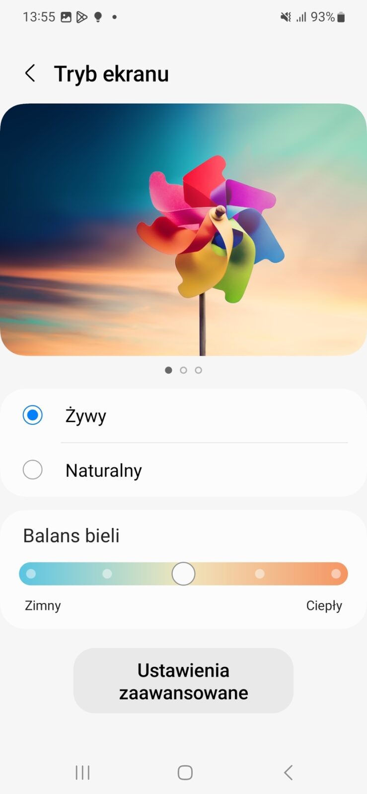 W ustawieniach znajdziemy tryb ciemny dla menu, możliwość zwiększenia czułości dotyku oraz regulacji balansu bieli, nasycenia barw i częstotliwości odświeżania.