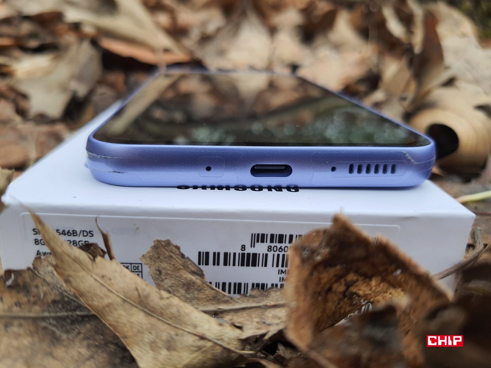 Jakość wykonania jest jak najbardziej w porządku. Powiem więcej – jest bardzo dobra. Samsung Galaxy A54 5G został wykonany z dwóch płaskich tafli szkła Corning Gorilla Glass 5, przedzielonych korpusem z tworzywa sztucznego. Co ważne, obudowa spełnia normę IP67, co oznacza odporność na pył oraz na zanurzenia w wodzie na głębokość do 1 metra, na czas nie dłuższy niż 30 minut. To spory plus. Na minus – duża widoczność odcisków palców zostawianych na obudowie (nie licząc ramki, która jest matowa).