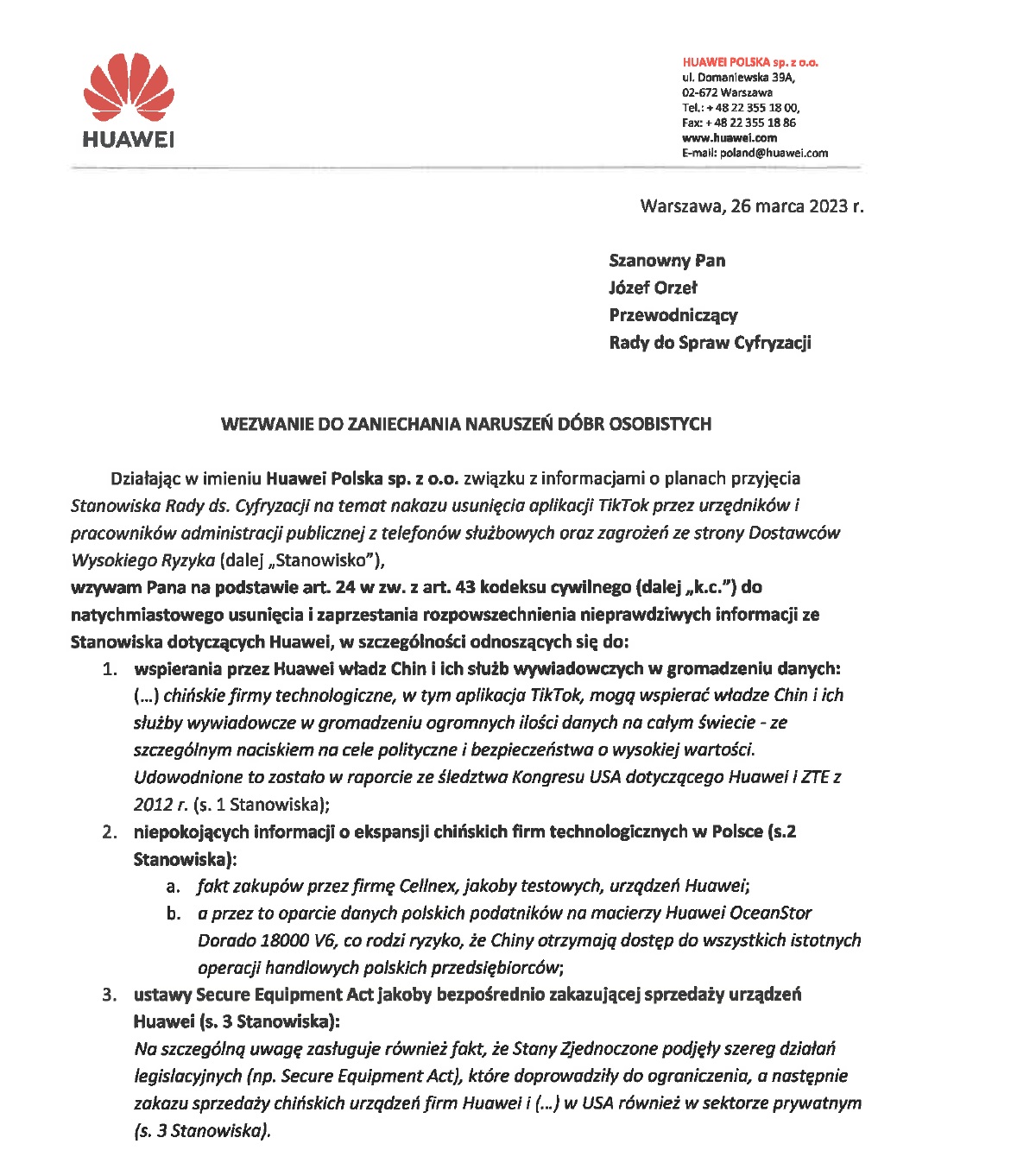 Takiego obrotu sprawy chyba nikt się nie spodziewał. Huawei wystosował pismo do przewodniczącego Rady ds. cyfryzacji. Wzywa w nim do zaniechania naruszeń dóbr osobistych na podstawie art. 24 w zw. z art. 43 Kodeksu Cywilnego. Firma zwraca uwagę, że stanowisko Rady zawiera nieprawdziwe informacje w trzech kwestiach: