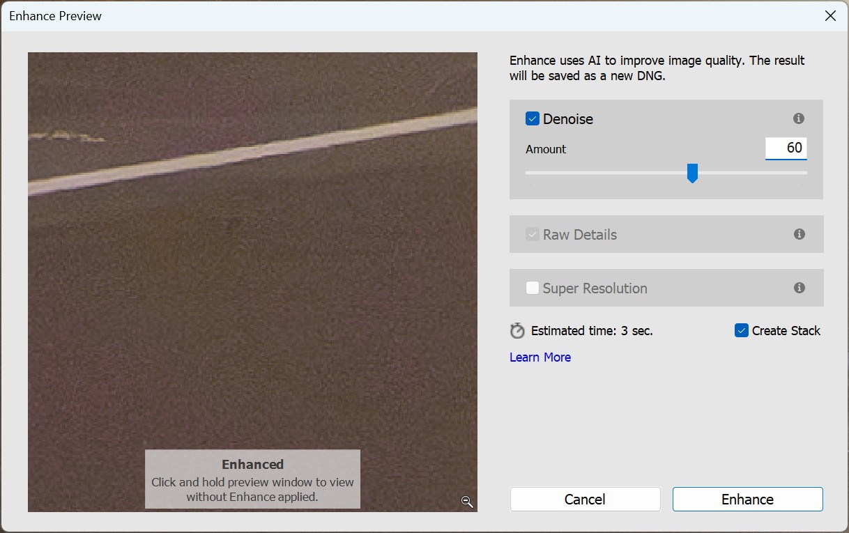 Efekt działania funkcji Denoise zapisywany jest jako osobny plik DNG, który można edytować jak normalny RAW z aparatu i oczywiście najlepiej, by procedura była przeprowadzana na początku edycji. W tej chwili algorytm pracuje wyłącznie z plikami RAW, lecz wkrótce najprawdopodobniej poradzi sobie także z wyjściowymi plikami obrazów.