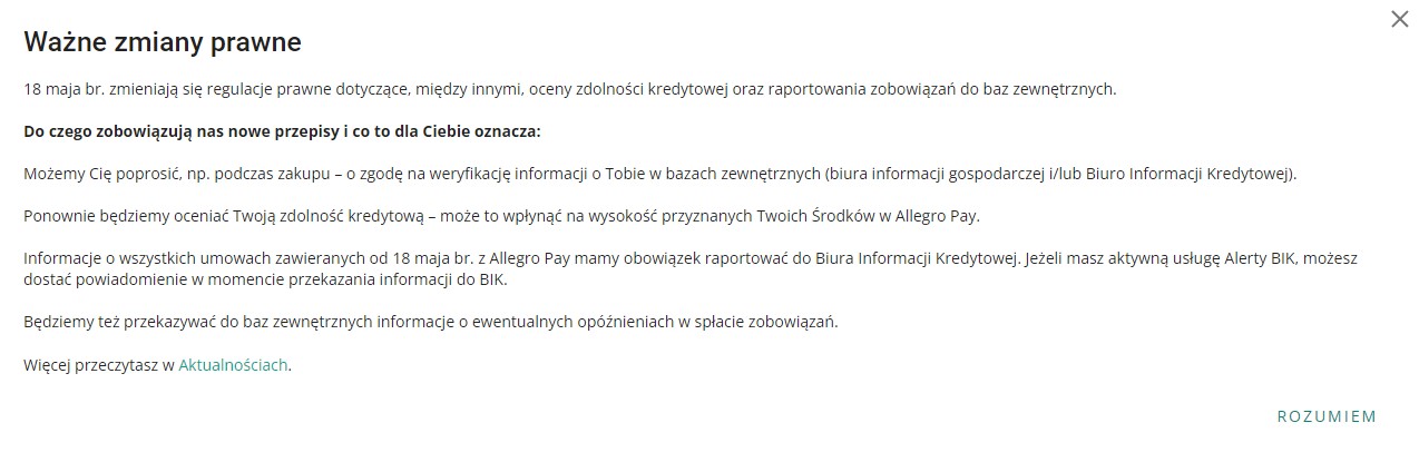 18 maja 2023 roku wejdzie w życie ustawa z dnia 6 października 2022 roku o zmianie ustaw w celu przeciwdziałania lichwie. Wprowadzone przez nią zmiany w prawie dotyczą m.in. przepisów o ocenie zdolności kredytowej oraz przekazywania informacji o zobowiązaniach kredytowych do zewnętrznych baz. Do nowych przepisów musi też dostosować się Allegro, o czym serwis zaczął już informować swoich klientów.