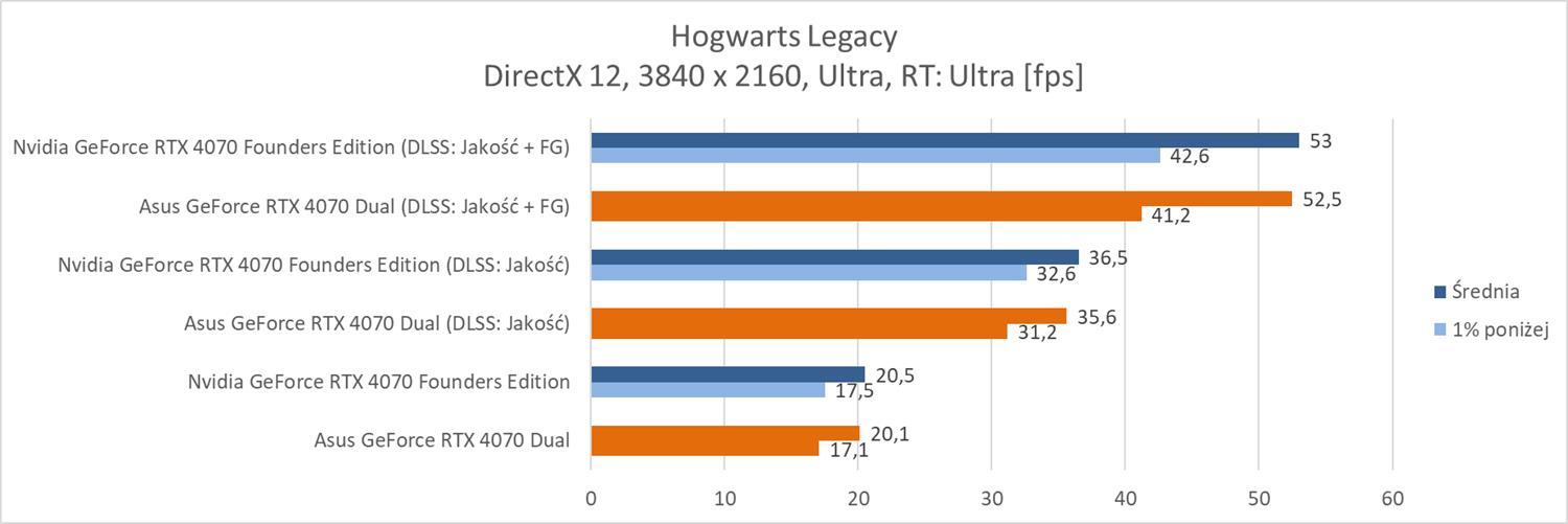 W Hogwarts Legacy z RT na Ultra nie pogracie nawet w 1920 x 1080 przy 60 fps. Zdecydowanie więc potrzebny jest DLSS, choć w 3840 x 2160 nawet przy włączonym generatorze klatek nie uzyskacie takiej wartości. Ponownie jednak widać, że DLSS 3 jest ogromną zaletą testowanego modelu, który pozwala na znaczne podbicie fps w grach.