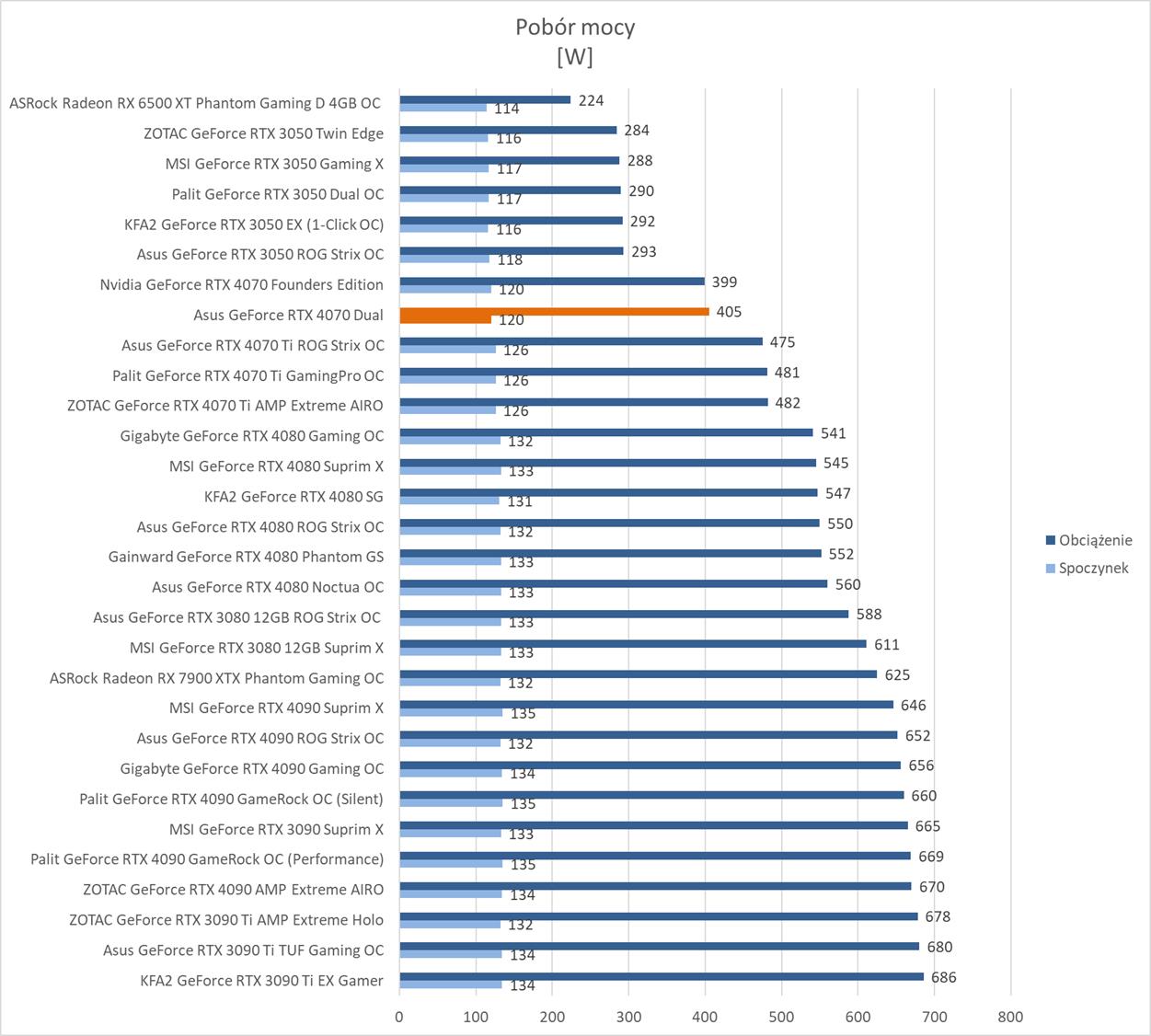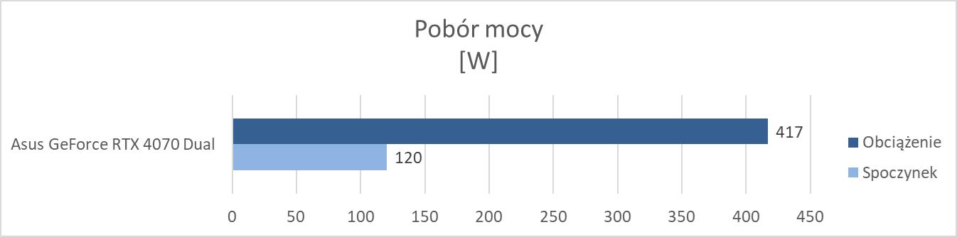 Pobór mocy jest na poziomie modelu Founders Edition, więc jest naprawdę dobrze. Widać też spory spadek względem RTX 4070 Ti.