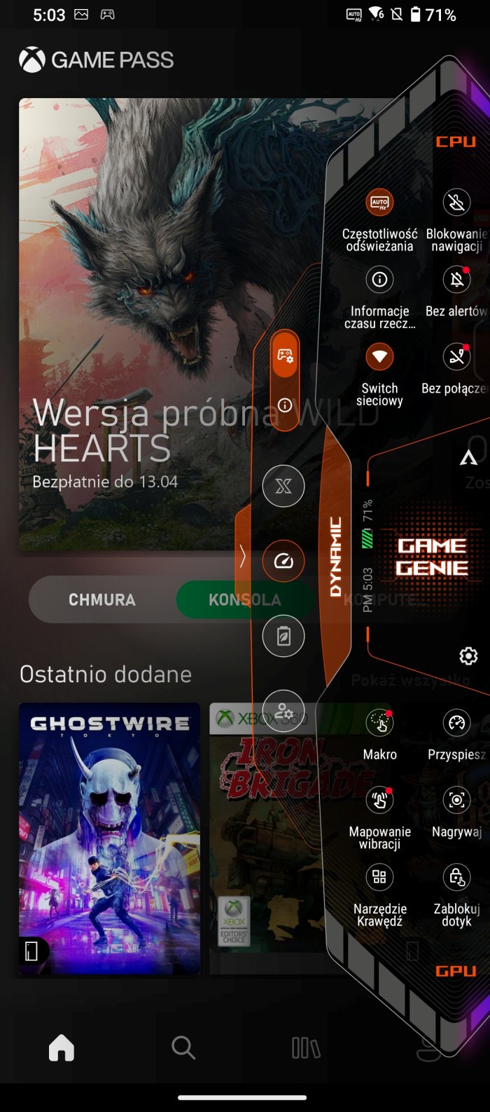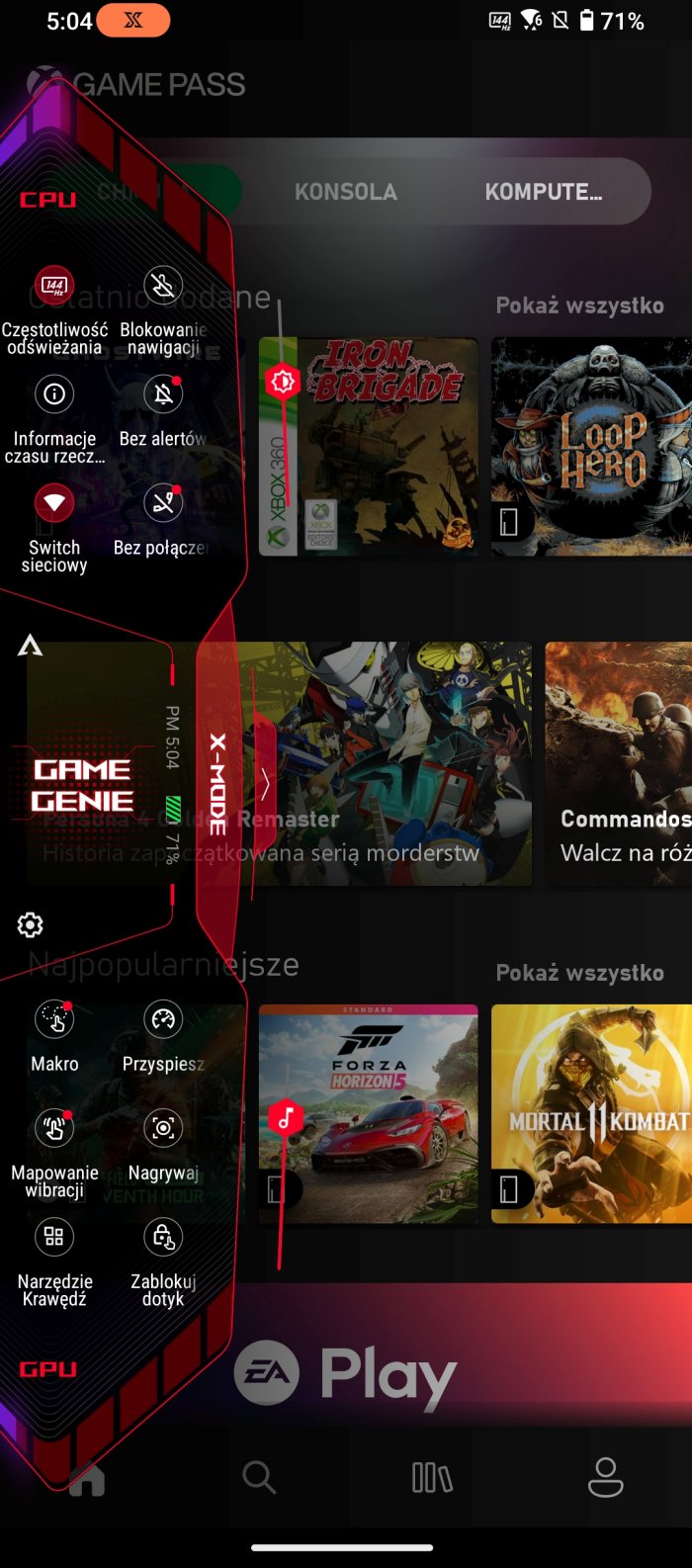 Do tego mamy podbijający wydajność „tryb X” oraz znaną już z poprzednich ROG Phone’ów nakładkę „Game Genie”, którą wywołujemy przeciągnięciem palca w prawego lub lewego górnego rogu ekranu. Nakładka pozwala nam „w locie” zmieniać kluczowe parametry, takie jak częstotliwość odświeżania ekranu, włączenie „trybu X”, etc.