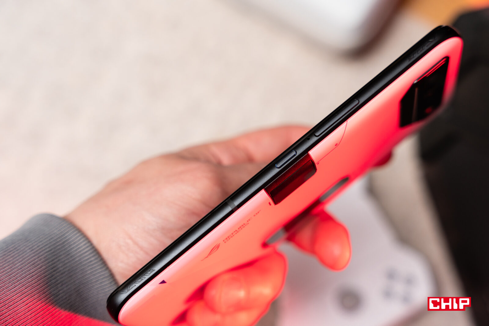 Wizualnie ROG Phone 7 Ultimate jest niemal identyczny z ubiegłorocznym modelem czy wersją 6D i patrząc z perspektywy czasu, o ile dodatkowy ekran wyświetlający grafiki, powiadomienia czy status ładowania to fajny bajer, tak użytkowo jest to… no właśnie, tylko bajer. Po dwóch dniach korzystania z telefonu człowiek w ogóle o nim zapomina, tym bardziej, że przecież mało kto kładzie telefon ekranem do dołu. ROG Phone 7 oferuje za to podświetlaną diodę z estetycznym logo Republic of Gamers, a też jego półprzezroczysta konstrukcja w górnej części obudowy przemawia do mnie zdecydowanie bardziej. Poza tym obydwa modele oferują dokładnie te same funkcje – dwa złącza USB-C (jedno na boku, drugie u dołu obudowy), gniazdo słuchawkowe oraz haptyczne przyciski AirTriggers na krawędzi obudowy, których działanie możemy przypisać do dowolnego miejsca na ekranie, więc przydadzą się w każdej grze wykorzystującej interfejs dotykowy, zwłaszcza w shooterach czy wyścigach.