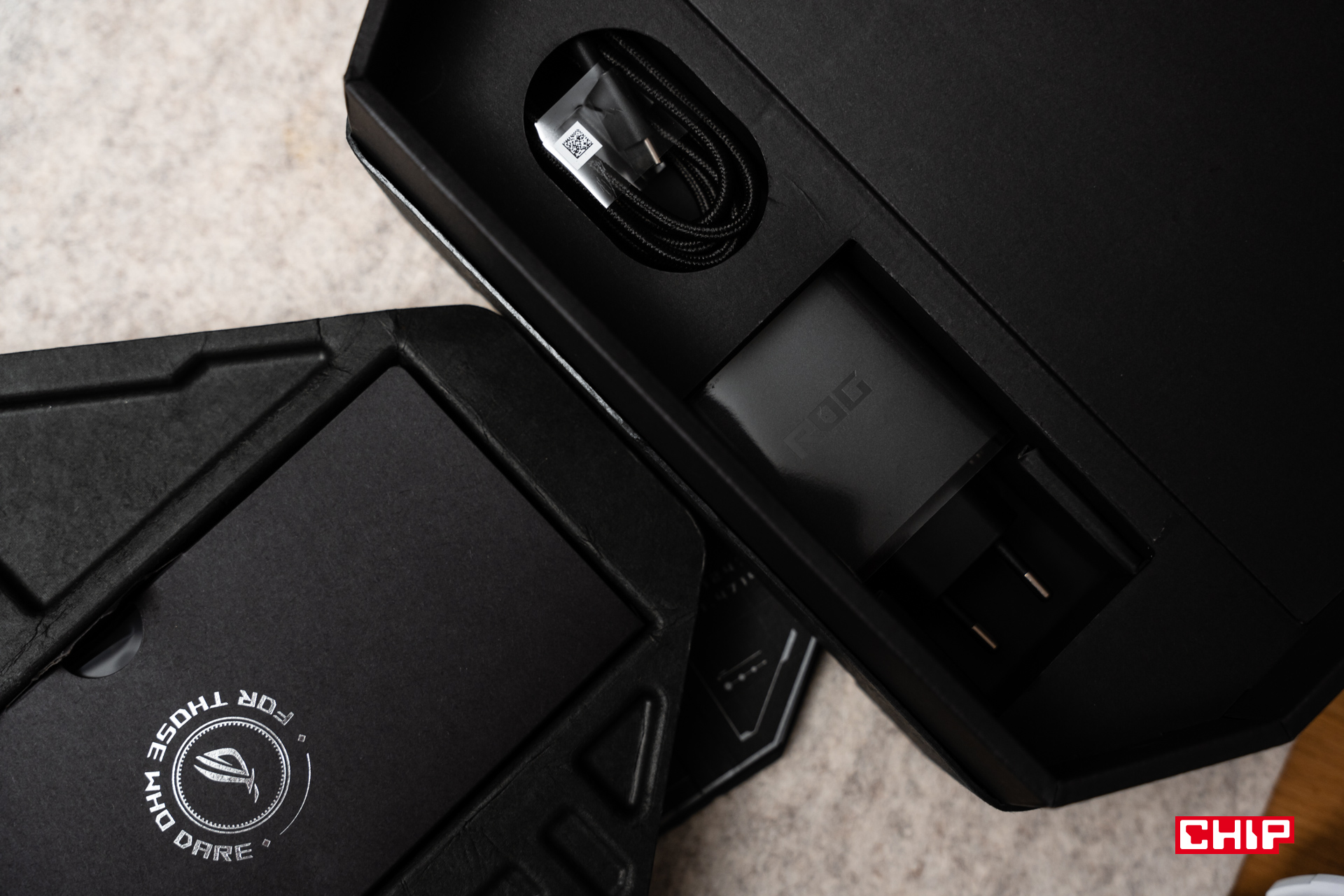 Muszę też poświęcić chwilę zestawowi sprzedażowemu, bo Asus zawstydza tutaj każdego konkurenta. Najbogatszy wariant trafia do klienta w naprawdę ogromnym, widocznym na zdjęciu opakowaniu, które – podobnie jak rok temu – pełni nie tylko funkcję ozdobną, ale jest też elementem pierwszej „misji”, którą możemy przejść po uruchomieniu telefonu. W zestawie znajdziemy też dodatkowe etui, ładowarkę, przewód, oraz akcesorium chłodzące. Może z punktu widzenia ekologii nie jest to rozwiązanie optymalne (choć pudełko jest niemal w całości kartonowe, więc plastik został ograniczony do minimum), ale za to jako klient czuję się nieporównywalnie bardziej „dopieszczony” niż kupując topowego Samsunga czy iPhone’a, do których nie dostaję nawet ładowarki.