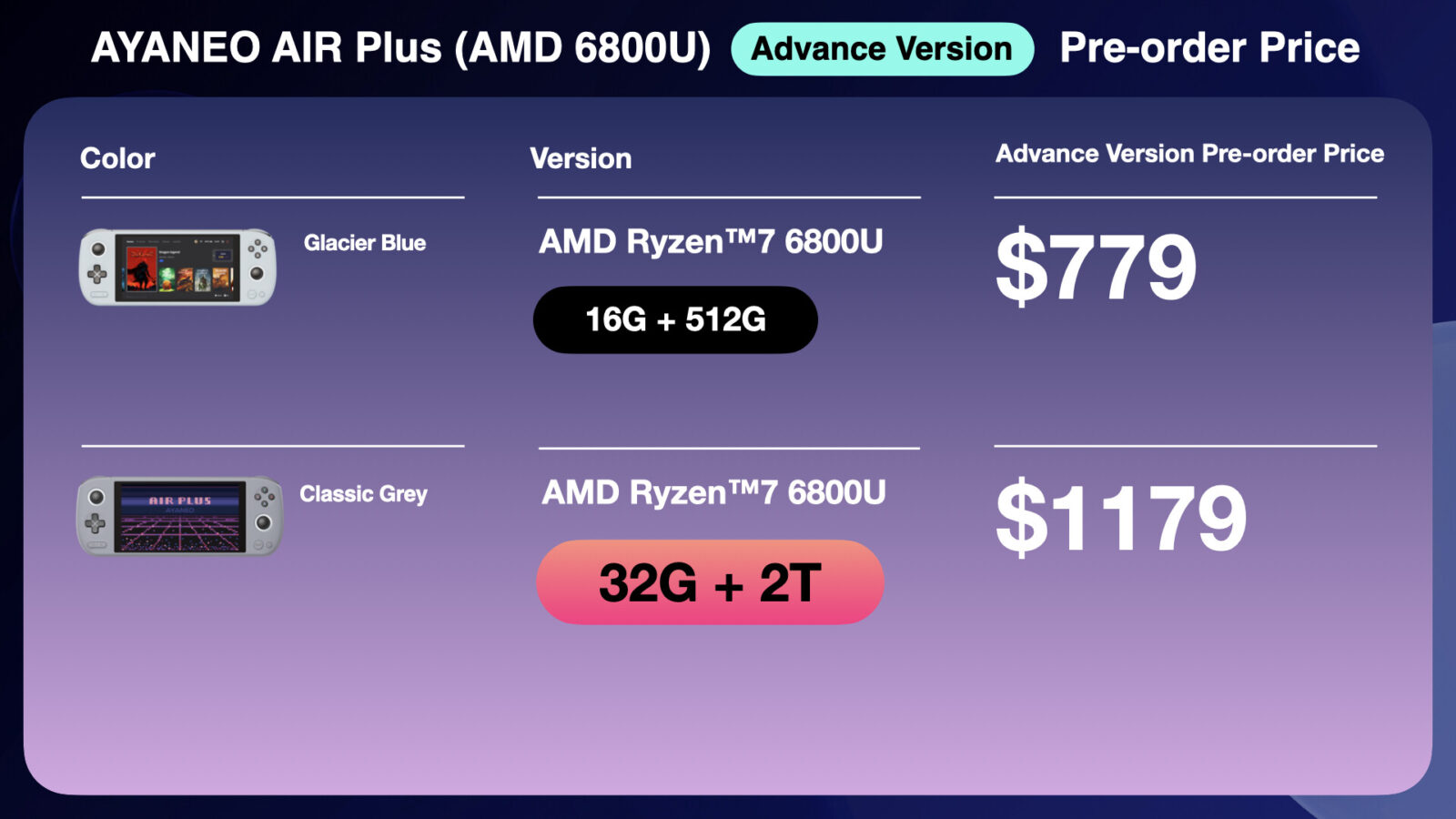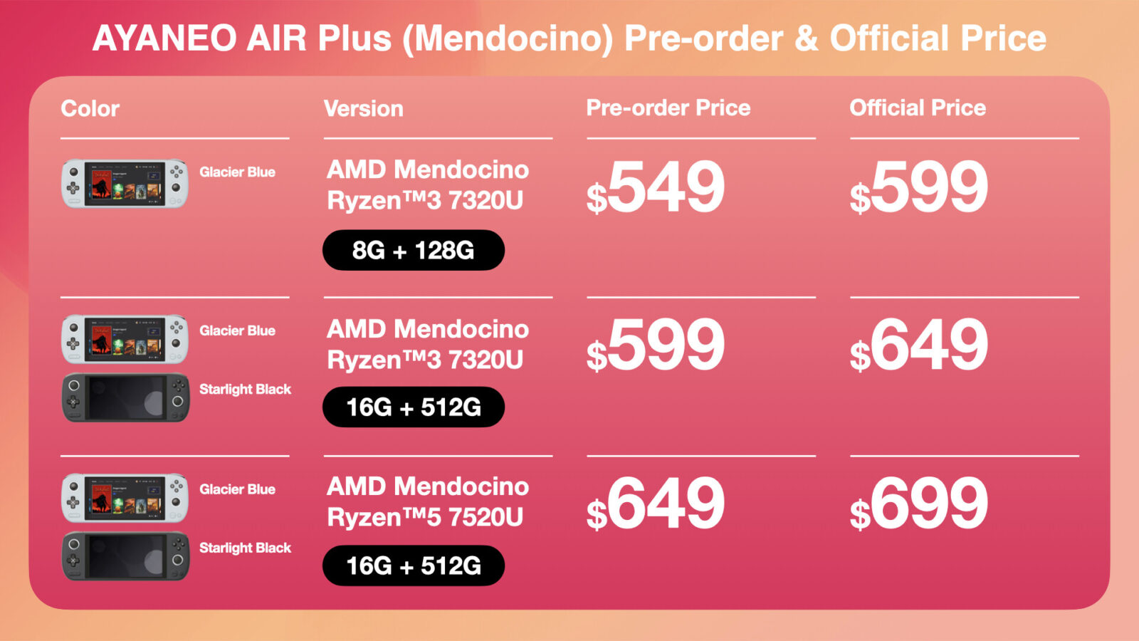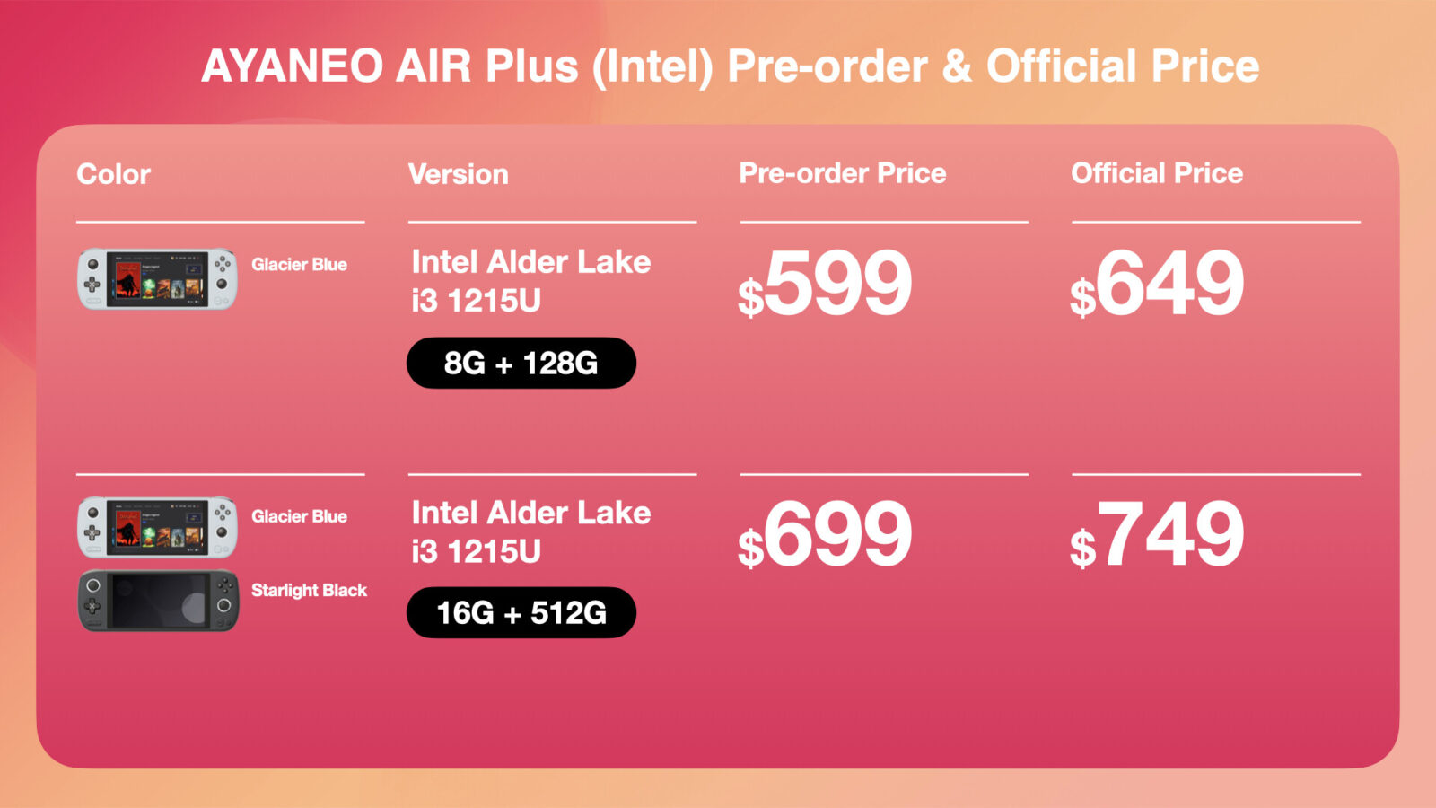 W przedsprzedaży ceny zaczynają się od 549 dolarów za wariant z procesorem Ryzen 3 7320U w wersji 8/128 GB. Za wersję napędzaną przez Intel i3 1215U zapłacimy od 599 dolarów (8 GB RAM +128 GB), natomiast ceny Ryzen 7 6800U zaczynają się od 889 dolarów za wariant 16 GB + 512 GB, aż do 1289 dolarów za opcję z 32 GB RAM i 2 TB. Warto jeszcze wspomnieć, że AyaNeo przygotowała zaawansowaną wersję Air Plus z Ryzen 7 6800U – te modele są cięższe i obsługują szybszą pamięć RAM LPDDR5-6400. Pozostała specyfikacja pozostaje bez zmian. Powyższe ceny obowiązują tylko w przedsprzedaży, ceny regularne będą już nieco wyższe.