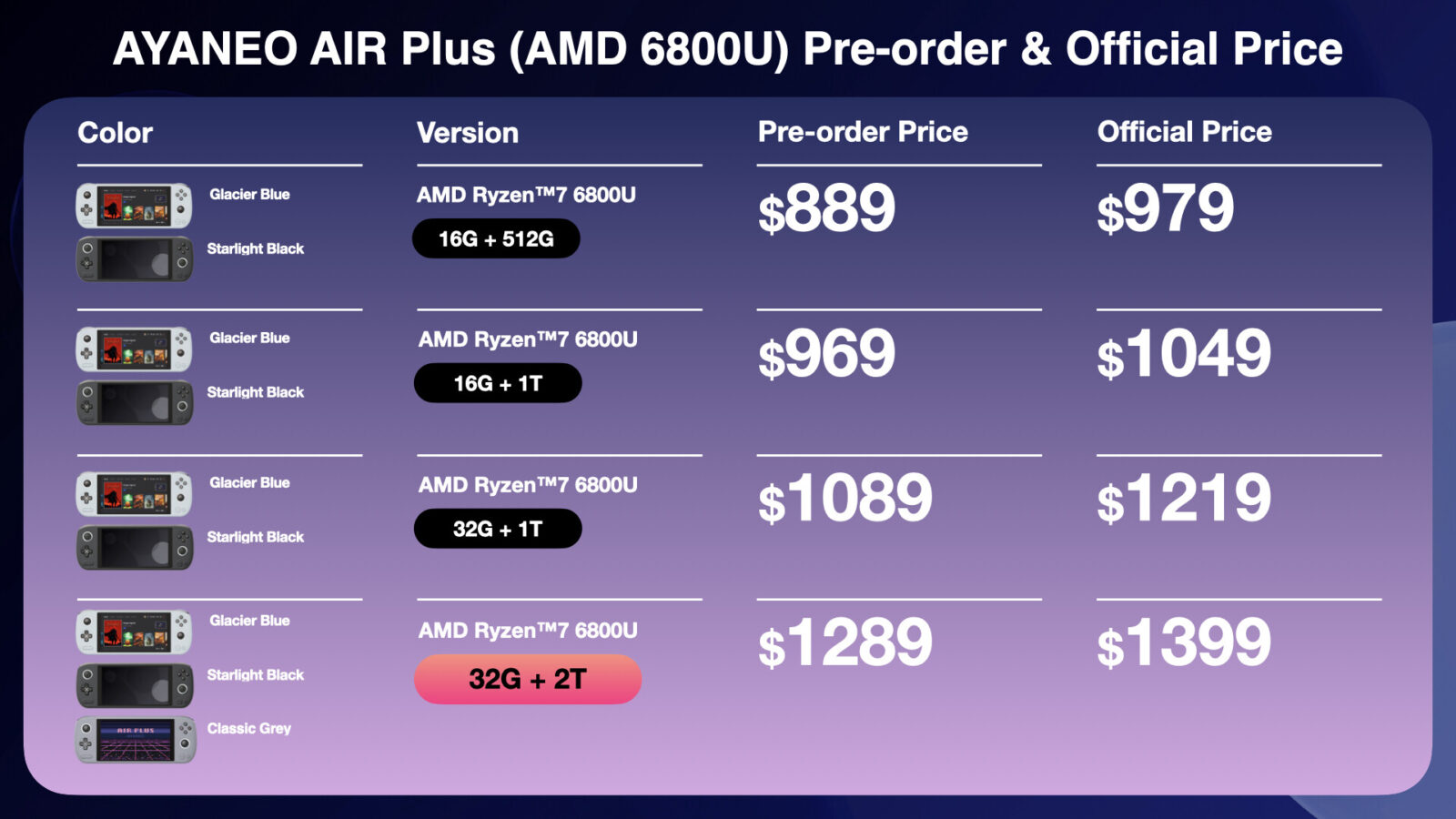 Niestety, AyaNeo nie udało się spełnić wcześniejszych obietnic, bo podczas pierwszych zapowiedzi w ubiegłym roku mowa była o cenie początkowej poniżej 300 dolarów za najbardziej podstawową konfigurację. Tego osiągnąć się nie udało. Ile więc trzeba zapłacić za AyaNeo Air Plus zwłaszcza w tej najwydajniejszej i najbardziej zaawansowanej wersji? Dużo, dużo więcej.