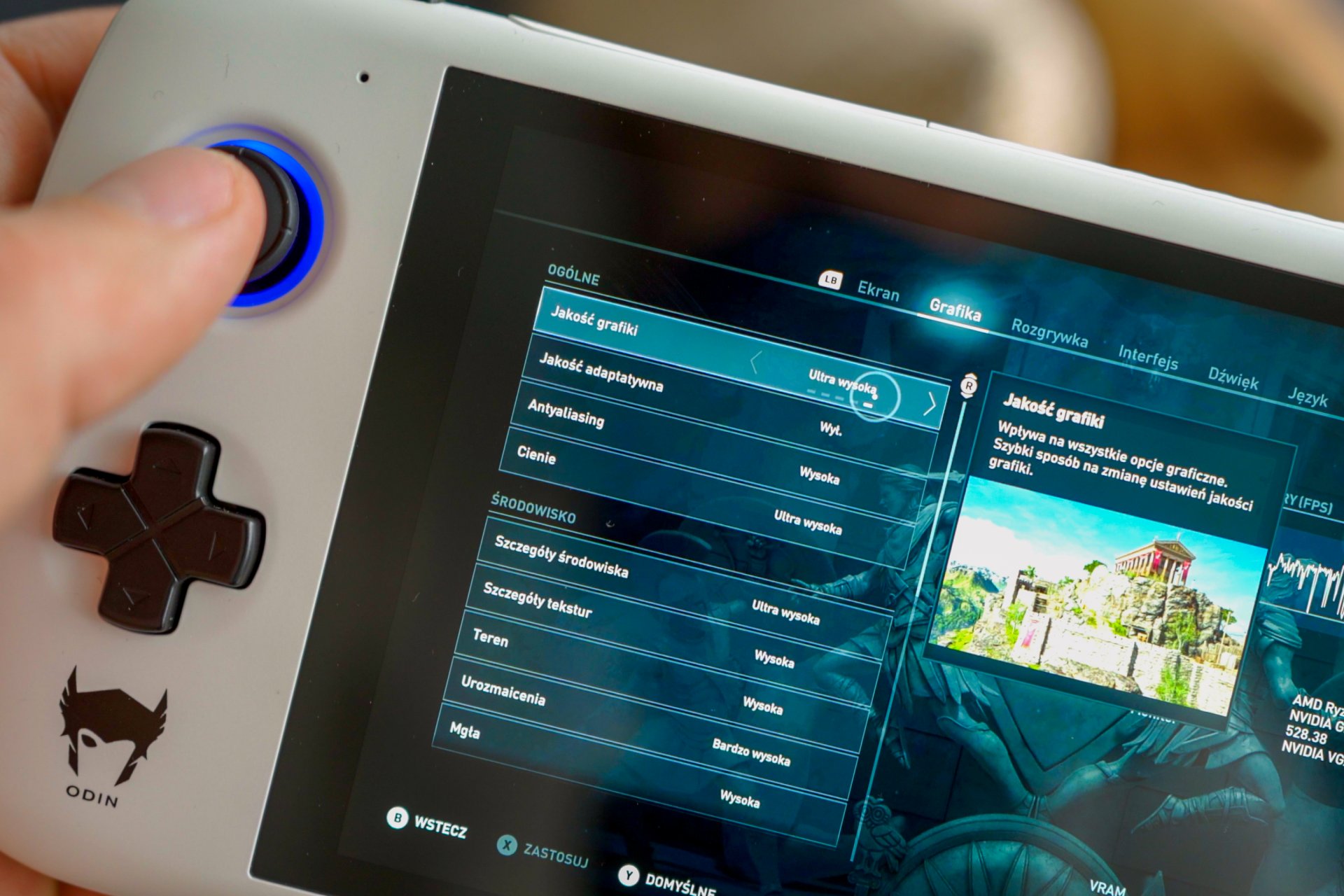 Całość jest bardzo dobrze wyprofilowana i wygodnie leży w dłoniach, a ergonomię poprawiają pogrubienia w tylnej części, tuż pod palcami. Tego elementu bardzo brakuje mi w Nintendo Switchu. Najsłabszym elementem sprzętowym Odina są analogi, które są dość małe i do tego są bardzo głęboko osadzone. Da się na nich grać nawet w najnowsze tytuły AAA (oczywiście w streamingu), ale byłoby wygodniej, gdyby grzybki były większe.
