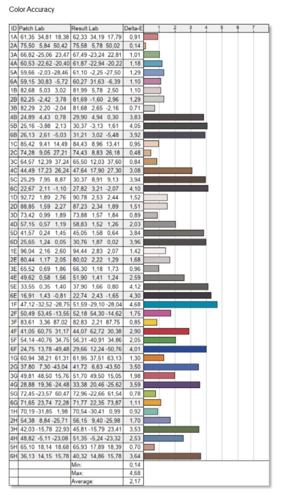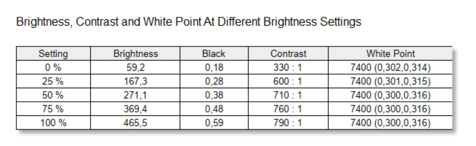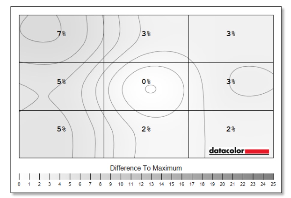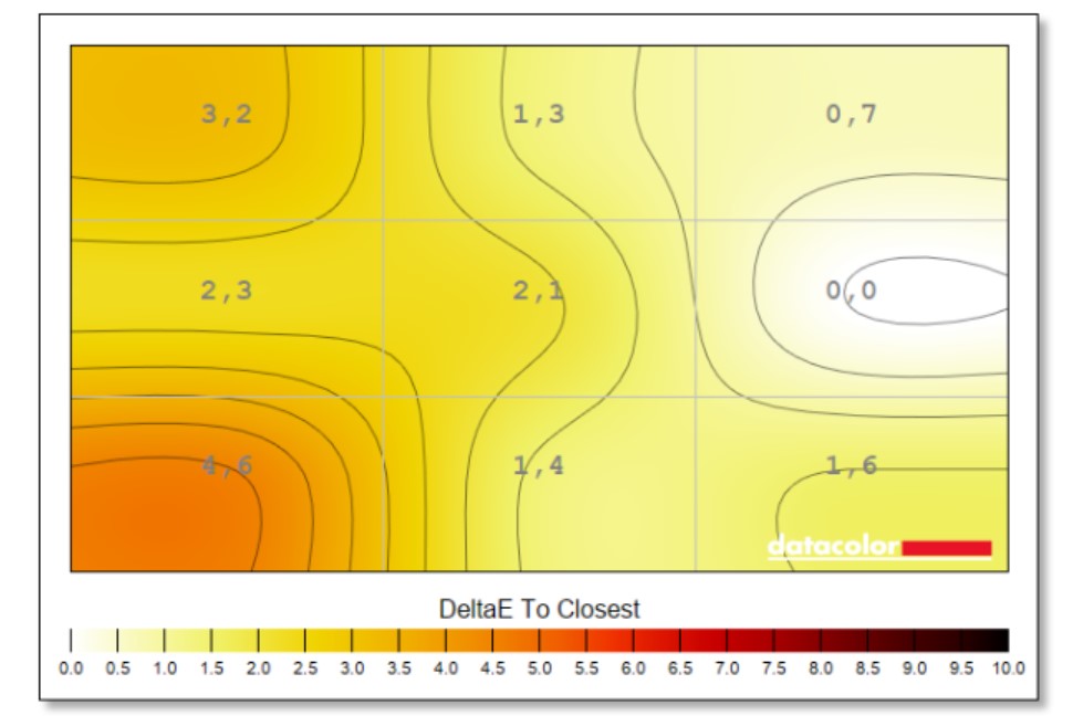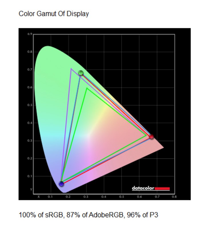 Pokrycie kolorów wynosi 100% sRGB, 87% AdobeRGB i 96% P3. Są to bardzo dobre wartości, a samo P3 jest bliskie deklarowanemu przez producenta. Gamma to 2,1, czyli minimalnie brakuje do idealnej. Maksymalna zmierzona jasność wyniosła 465,5 cd/m^2 przy kontraście 790:1. Pod tym względem jest bardzo dobrze. Punk bieli to 7400 i mógłby być on za to trochę lepszy. Nierównomierność kolorów jest dobra, podobnie jak podświetlenie. Najbardziej odstaje lewy górny róg (7%), co nie jest złym wynikiem. Średni błąd kolorów Delta-E wynosi 2,17 i tutaj widzę pole do poprawy.