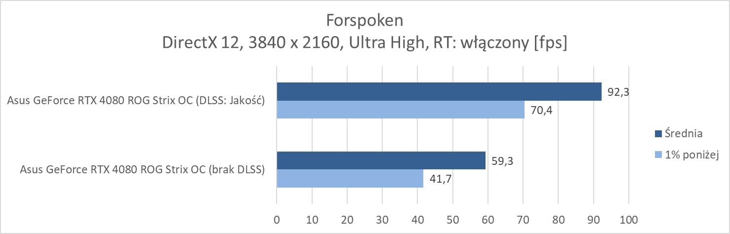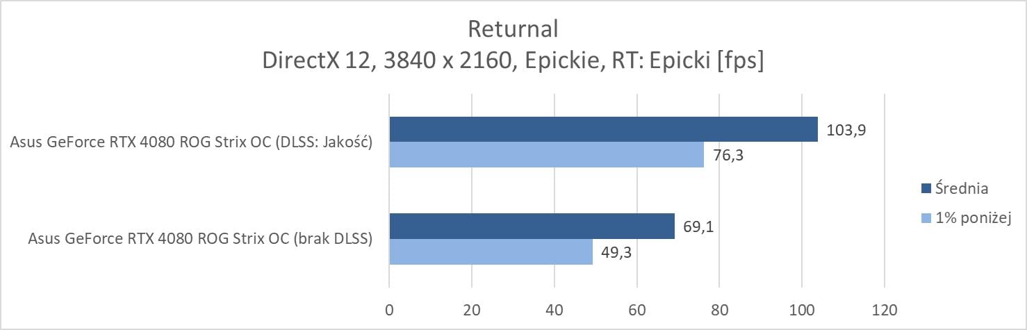 W większości gier, bez DLSS, średnia liczba fps była poniżej 60. Gry takie jak Hogwarts Legacy czy Cyberpunk 2077 notują ledwo powyżej 30 fps, więc nie są zbytnio grywalne. W Metro Exodus czy Forspoken wyniki są powyżej 50 fps, więc tutaj jest znacznie lepiej. Mamy też takie gry jak Returnal czy Far Cry, gdzie wyniki są znacznie wyższe.